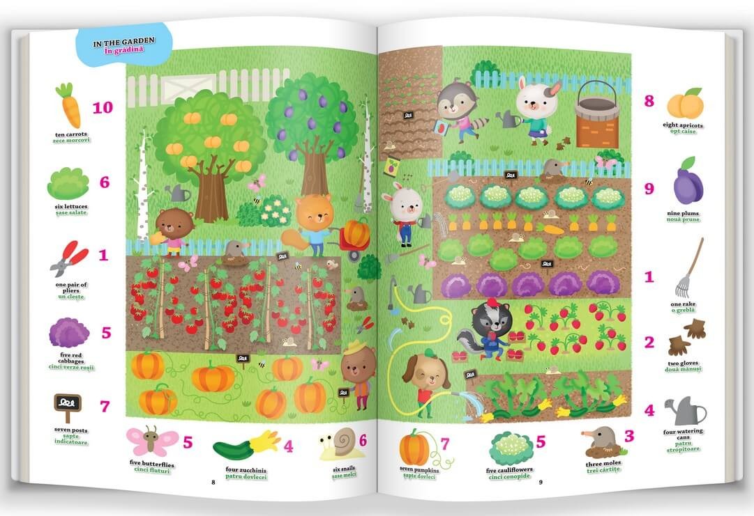 Încurajați-l să numere fiecare element zărit cu voce tare: one duck, two ducks etc., pentru a exersa și formarea pluralului. După ce numără cu ușurință până la zece, la finalul cărții va descoperi și numerele de la 11 la 15.