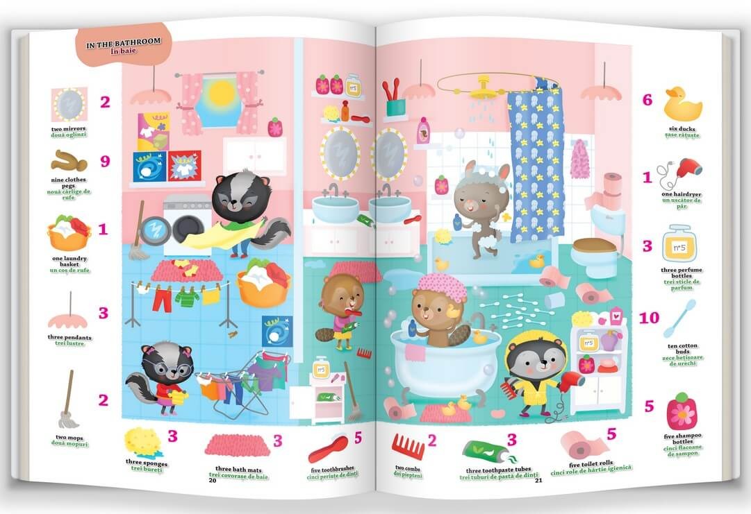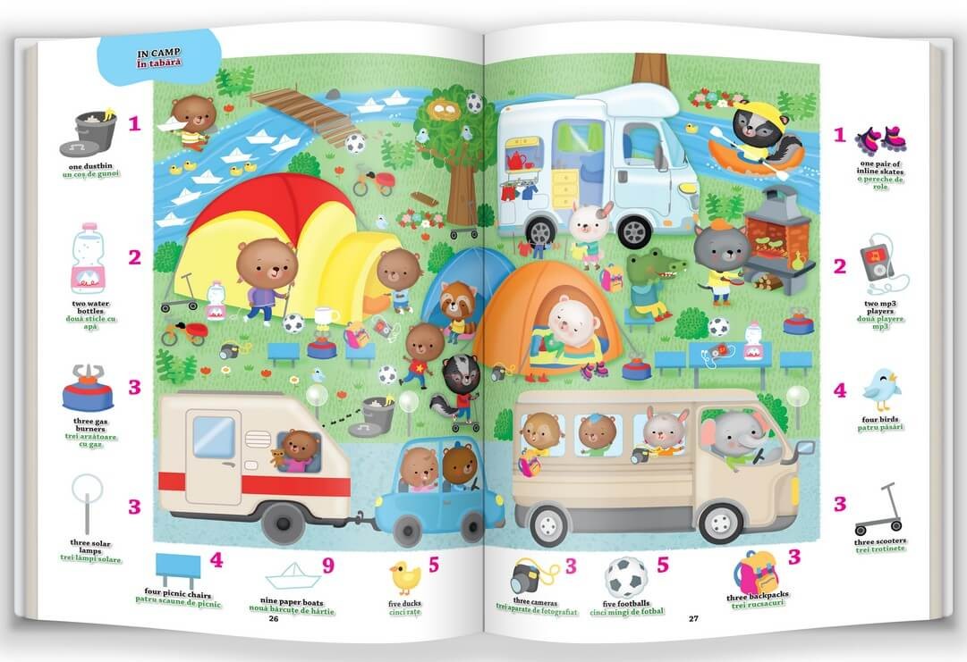 Cartea conține scene bogat ilustrate, în care copilul va trebui să găsească un anumit număr de obiecte indicate pe margini. Acest lucru îi va dezvolta spiritul de observație, capacitatea de concentrare și atenția.