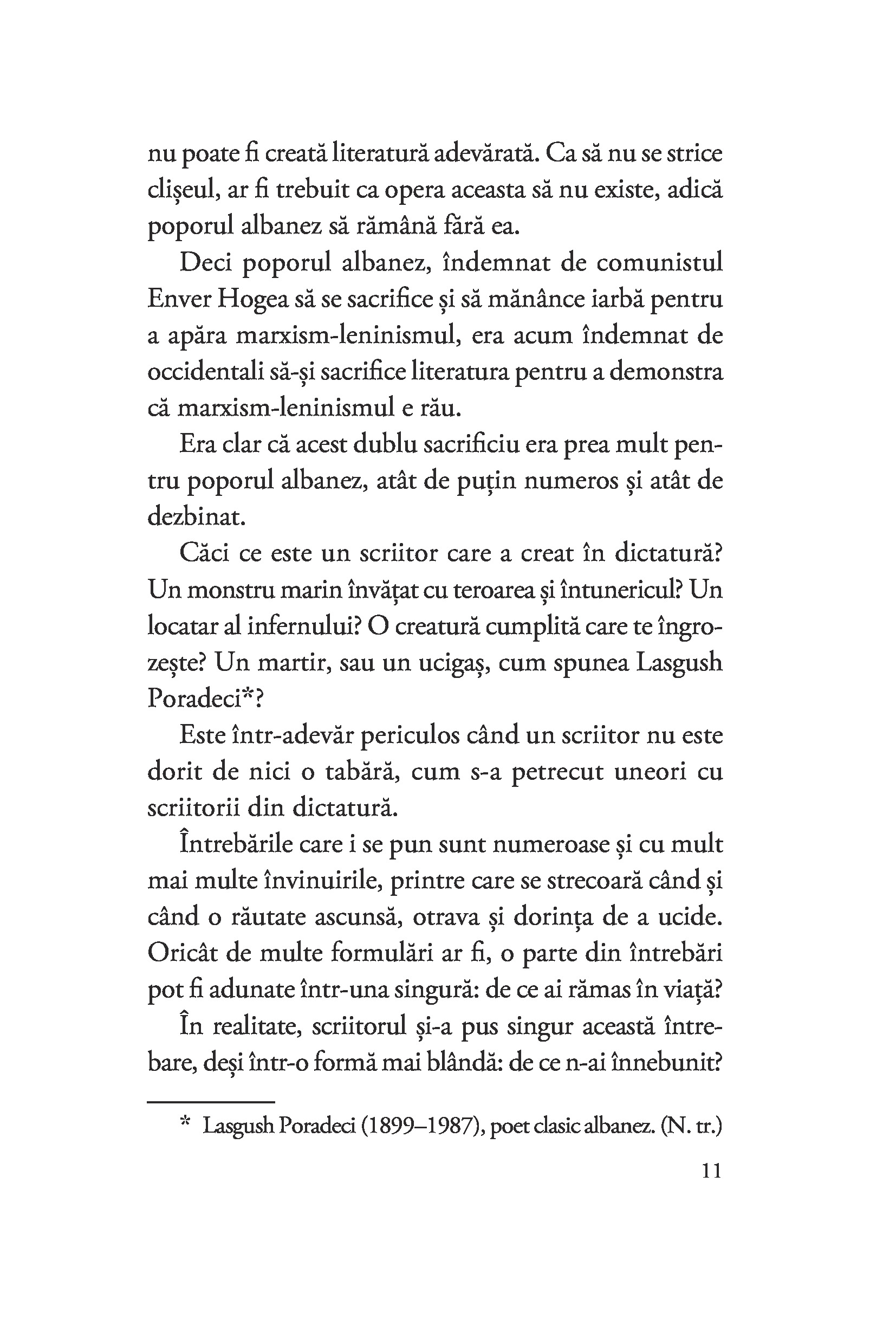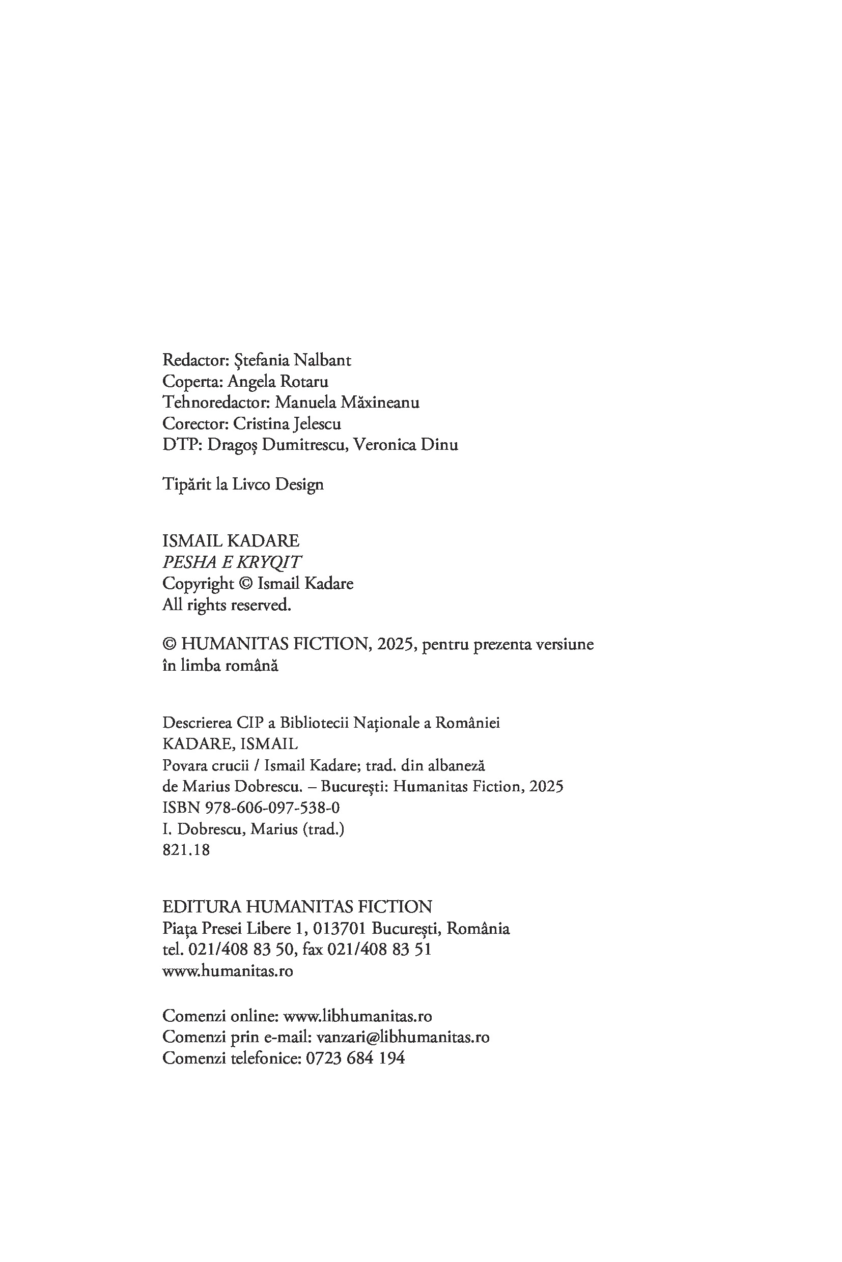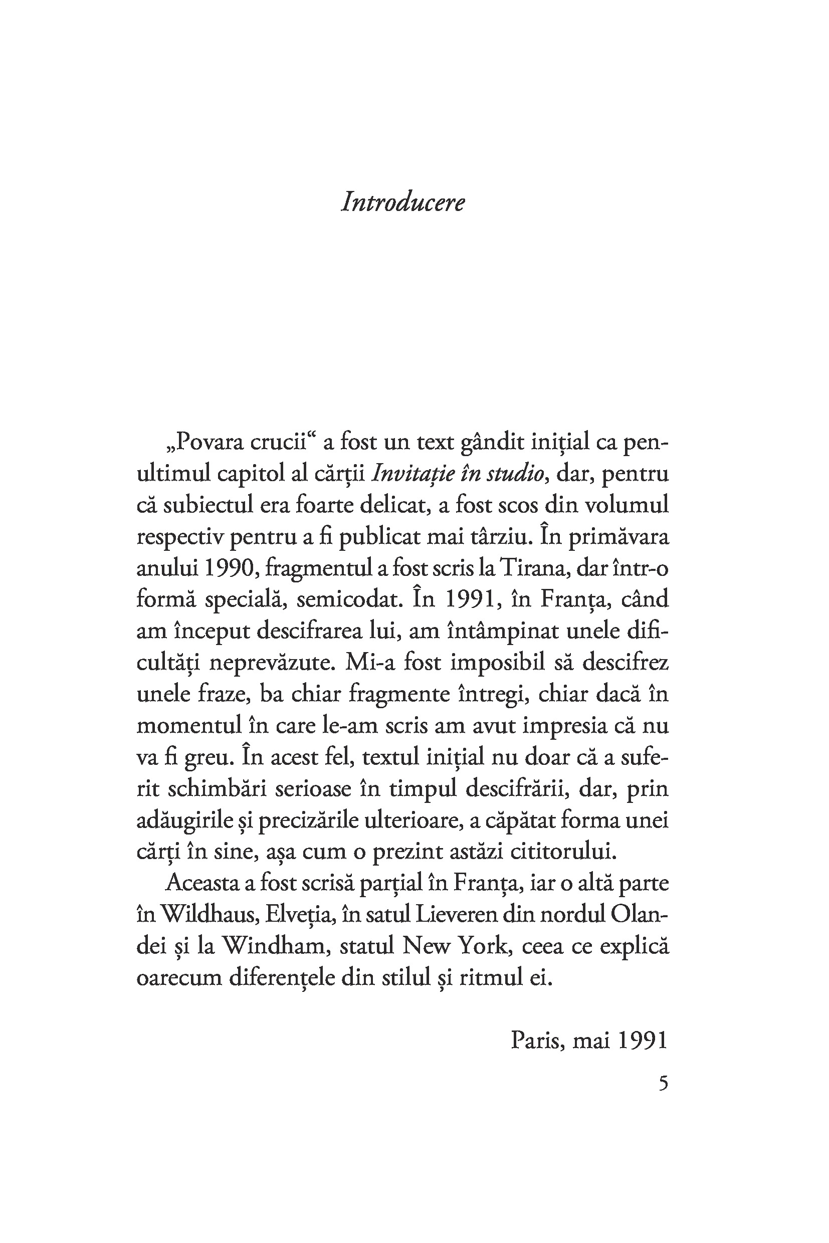 Publicat în iunie 1991 în Franța, la aproape un după ce autorul părăsise Albania, volumul Povara crucii este un rechizitoriu al celui mai dur comunism european, cel albanez. Ismail Kadare face o cronică amară a anilor 1960–1990, cei mai fertili din cariera sa, dar și perioada în care dominaţia statului dictatorial s-a impus total în literatură şi artă. Foarte puţini au fost scriitorii care au reuşit să răzbată prin ochiurile înguste ale plasei ideologice, iar Kadare a fost unul dintre ei. În ciuda constrângerilor, fricilor, mărturisite sau nu, a concesiilor.