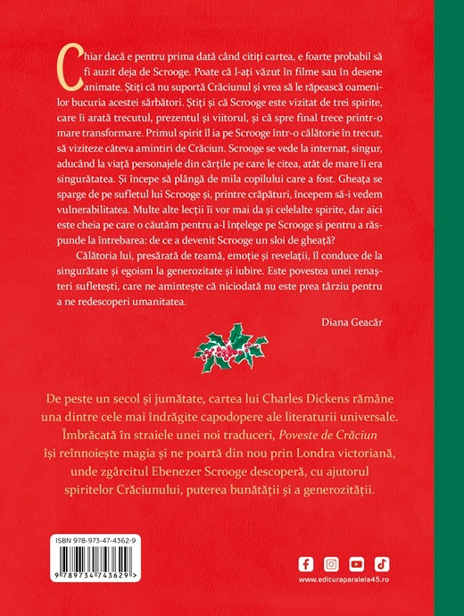 De peste un secol și jumătate, cartea lui Charles Dickens rămâne una dintre cele mai îndrăgite capodopere ale literaturii universale. Îmbrăcată în straiele unei noi traduceri, Poveste de Crăciun își reînnoiește magia și ne poartă din nou prin Londra victoriană, unde zgârcitul Ebenezer Scrooge descoperă, cu ajutorul spiritelor Crăciunului, puterea bunătății și a generozității.