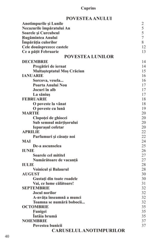 Cartea conţine scurte poveşti structurate pe două capitole mari: "Povestea anului" şi "Povestea lunilor". În aceste poveşti sunt descrise cele 4 anotimpuri, ca soţii ale Anului şi cele 12 luni, ca fiice ale Anului. În "Povestea lunilor", autoarea prezintă diferite aspecte specifice fiecărei luni, fiind ilustrat cel mai semnificativ moment al poveştii.