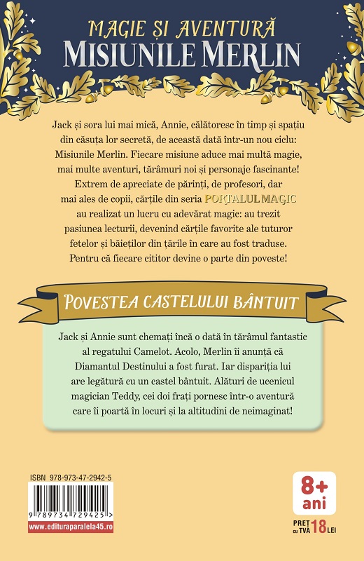 Jack și sora lui mai mică, Annie, călătoresc în timp și spațiu din căsuța lor secretă, de această dată într-un nou ciclu: Misiunile Merlin. Fiecare misiune aduce mai multă magie, mai multe aventuri, tărâmuri noi și personaje fascinante! Extrem de apreciate de părinți, de profesori, dar mai ales de copii, cărțile din seria PORTALUL MAGIC au realizat un lucru cu adevărat magic: au trezit pasiunea lecturii, devenind cărțile favorite ale tuturor fetelor și băieților din țările în care au fost traduse. Pentru că fiecare cititor devine o parte din poveste!