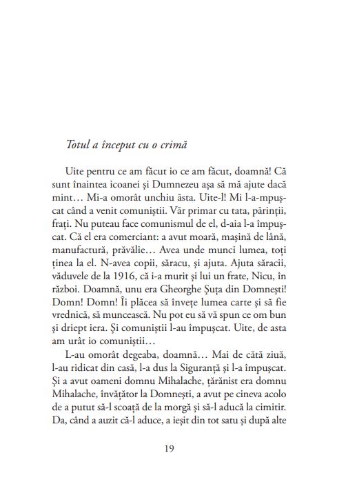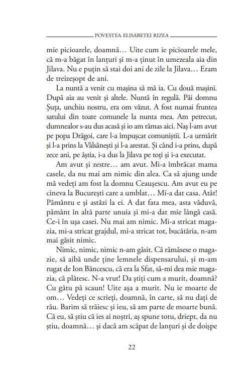 „Uite aşa-mi vin în minte... cum mi-au băgat ochelari d-ăştia de tablă, ferească Dumnezeu să ştiţi ce-i asta, şi m-a luat de braţ, că nu vedeam nimica pe coridor. Şi, ori că mi-a pus el piedică, ori m-am împiedicat - că am venit pă brânci, aşa, jos. Şi el mi-a dat cu bocancu aici, în coastă. Trăieşte în Piteşti. [...] El are burtă şi eu m-am uscat, că mă vedeţi cum sunt, numai piele şi os. Sunt ca o mască acum, doamnă, de chinurile care au fost pe mine şi de inima rea pe care am avut-o. Aşa. Şi să viu acasă să nu mai găsesc nimic!! Nimic n-am găsit. Dacă mă tăiam la un deget, eu n-aveam cu ce mă lega. Tot ce-am lăsat în casă şi în magazia mea şi în curtea mea - n-am mai găsit nimic. Nu mai pot să-mi spun tot amaru care a fost în mine şi tot chinu cu care m-a chinuit hoţii ăştia...“ – Elisabeta Rizea