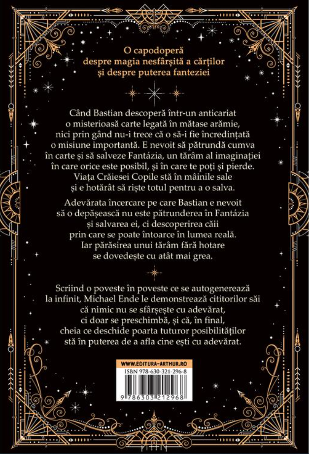 Când Bastian descoperă într-un anticariat o misterioasă carte legată în mătase arămie, nici prin gând nu-i trece că o să-i fie încredințată o misiune importantă. E nevoit să pătrundă cumva în carte și să salveze Fantázia, un tărâm al imaginației în care orice este posibil, și în care te poți și pierde. Viața Crăiesei Copile stă în mâinile sale și e hotărât să riște totul pentru a o salva.