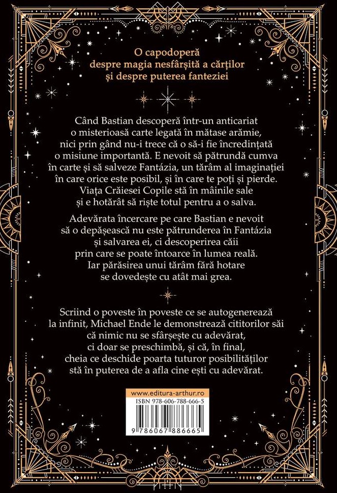 Când Bastian descoperă într-un anticariat o misterioasă carte legată în mătase arămie, nici prin gând nu-i trece că o să-i fie încredințată o misiune importantă. E nevoit să pătrundă cumva în carte și să salveze Fantázia, un tărâm al imaginației în care orice este posibil, și în care te poți și pierde. Viața Crăiesei Copile stă în mâinile sale și e hotărât să riște totul pentru a o salva.