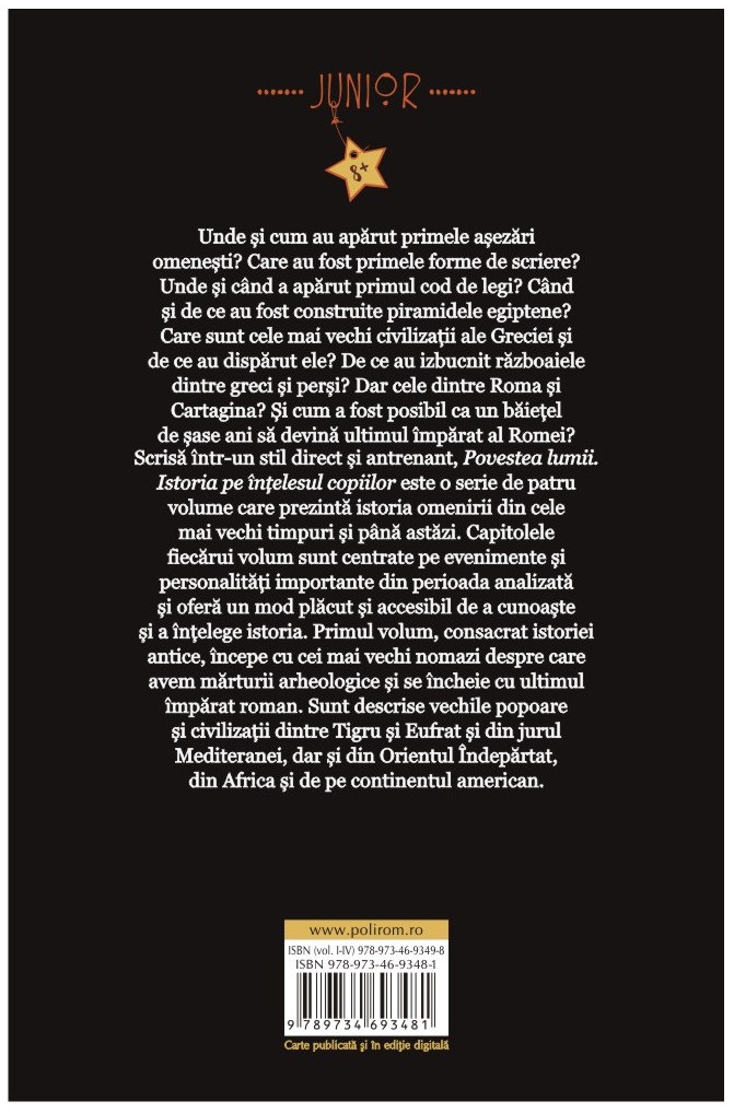 Scrisă într-un stil direct și antrenant, Povestea lumii. Istoria pe înțelesul copiilor este o serie de patru volume care prezintă istoria omenirii din cele mai vechi timpuri și până astăzi. Capitolele fiecărui volum sunt centrate pe evenimente și personalități importante din perioada analizată și oferă un mod plăcut și accesibil de a cunoaște și a înțelege istoria. Primul volum, consacrat istoriei antice, începe cu cei mai vechi nomazi despre care avem mărturii arheologice și se încheie cu ultimul împărat roman. Sunt descrise vechile popoare și civilizații dintre Tigru și Eufrat și din jurul Mediteranei, dar și din Orientul Îndepărtat, din Africa și de pe continentul american.