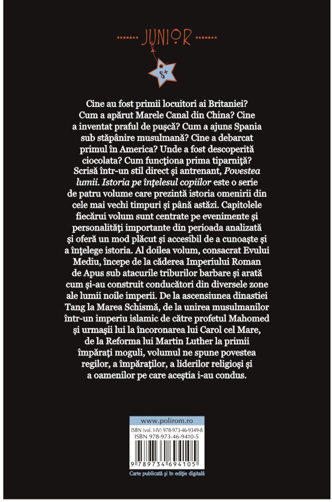 Cine au fost primii locuitori ai Britaniei? Cum a apărut Marele Canal din China? Cine a inventat praful de pușcă? Cum a ajuns Spania sub stăpânire musulmană? Cine a debarcat primul în America? Unde a fost descoperită ciocolata? Cum funcţiona prima tiparniţă? Scrisă într-un stil direct și antrenant, Povestea lumii. Istoria pe înţelesul copiilor este o serie de patru volume care prezintă istoria omenirii din cele mai vechi timpuri și până astăzi. Capitolele fiecărui volum sunt centrate pe evenimente și personalităţi importante din perioada analizată și oferă un mod plăcut și accesibil de a cunoaște și a înţelege istoria. Al doilea volum, consacrat Evului Mediu, începe de la căderea Imperiului Roman de Apus sub atacurile triburilor barbare și arată cum și-au construit conducători din diversele zone ale lumii noile imperii. De la ascensiunea dinastiei Tang la Marea Schismă, de la unirea musulmanilor într-un imperiu islamic de către profetul Mahomed și urmașii lui la încoronarea lui Carol cel Mare, de la Reforma lui Martin Luther la primii împăraţi moguli, volumul ne spune povestea regilor, a împăraţilor, a liderilor religioși și a oamenilor pe care aceștia i-au condus.