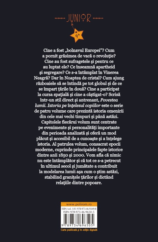 Scrisă într-un stil direct și antrenant, Povestea lumii. Istoria pe înțelesul copiilor este o serie de patru volume care prezintă istoria omenirii din cele mai vechi timpuri și până astăzi. Capitolele fiecărui volum sunt centrate pe evenimente și personalități importante din perioada analizată și oferă un mod plăcut și accesibil de a cunoaște și a înțelege istoria. Al patrulea volum, consacrat epocii moderne, cuprinde principalele fapte istorice dintre anii 1850 și 2000. Vom afla că nimic nu este întâmplător și că tot ce s-a petrecut în ultimul secol și jumătate a contribuit la modelarea lumii așa cum o știm astăzi, stabilind granițele țărilor și dictând relațiile dintre popoare.