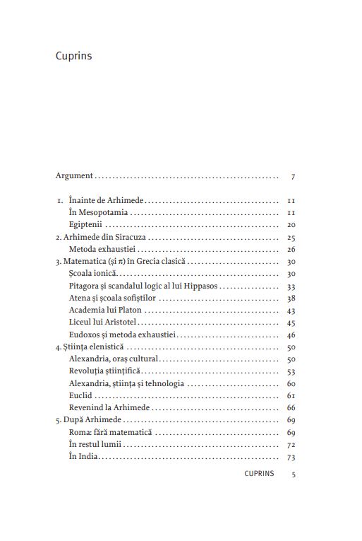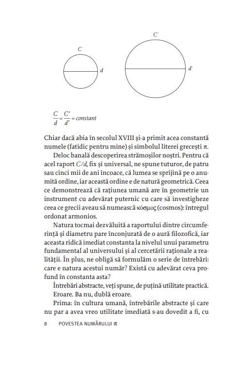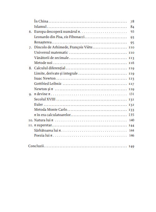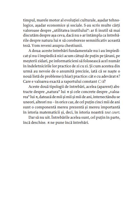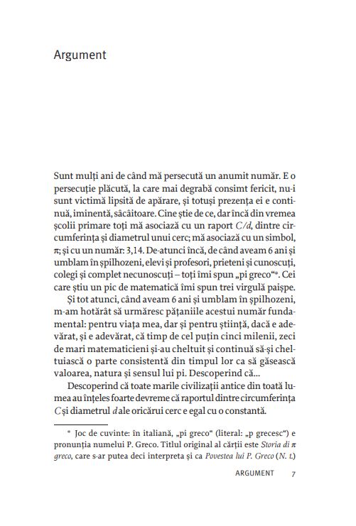 Nici un alt număr n-a dobândit celebritatea (matematică și nu numai) de care se bucură numărul π, raportul dintre circumferința unui cerc și diametrul lui. Urmărindu-i destinul încă din antichitatea egipteană și mesopotamiană, Pietro Greco ajunge să refacă, la nivelul evoluției con­ceptelor, o bună parte din istoria matematicii, în care apare personaje marcante: Arhimede, Newton, Euler, Cantor. Și, în același timp, autorul surprinde cu finețe poezia de care se înconjoară acest număr care de milenii ne stimulează imaginația.