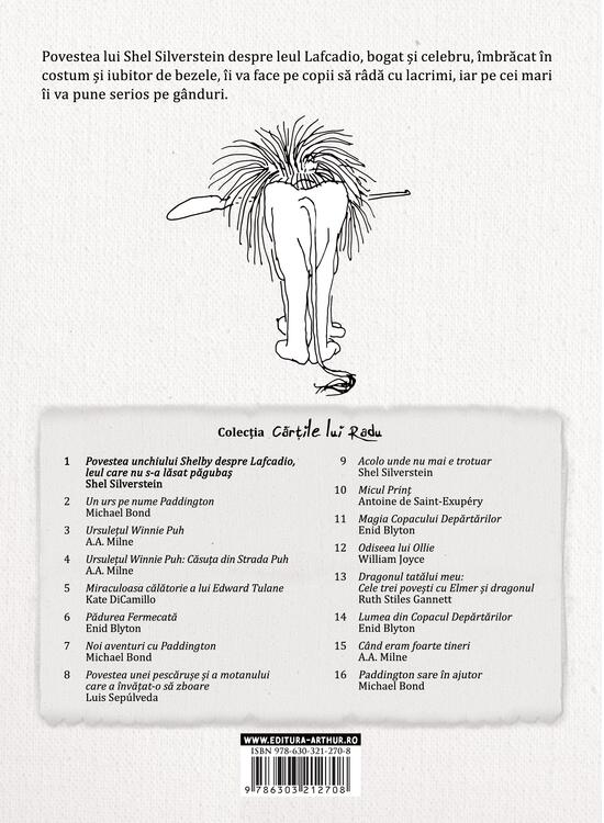 Povestea lui Shel Silverstein despre leul Lafcadio, bogat şi celebru, îmbrăcat în costum şi iubitor de bezele, îi va face pe copii să râdă cu lacrimi, iar pe cei mari îi va pune serios pe gânduri.