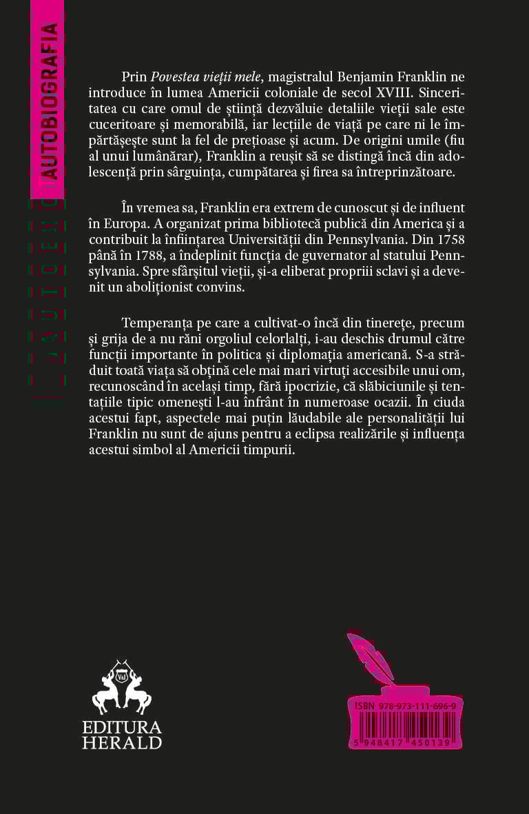 Prin Povestea vietii mele, magistralul Benjamin Franklin ne introduce in lumea Americii coloniale de secol XVIII. Sinceritatea cu care omul de stiinta dezvaluie detaliile vietii sale este cuceritoare si memorabila, iar lectiile de viata pe care ni le impartaseste sunt la fel de pretioase si acum. De origini umile (fiu al unui lumanarar), Franklin a reusit sa se distinga inca din adolescenta prin sarguinta, cumpatarea si firea sa intreprinzatoare.