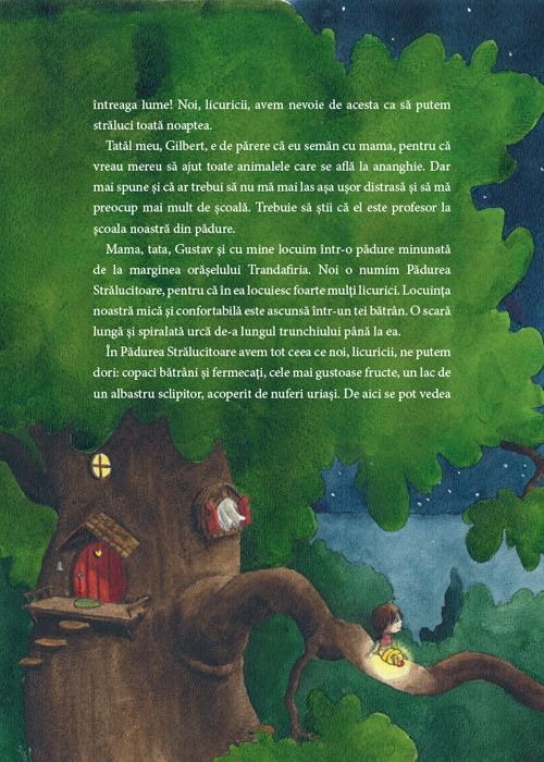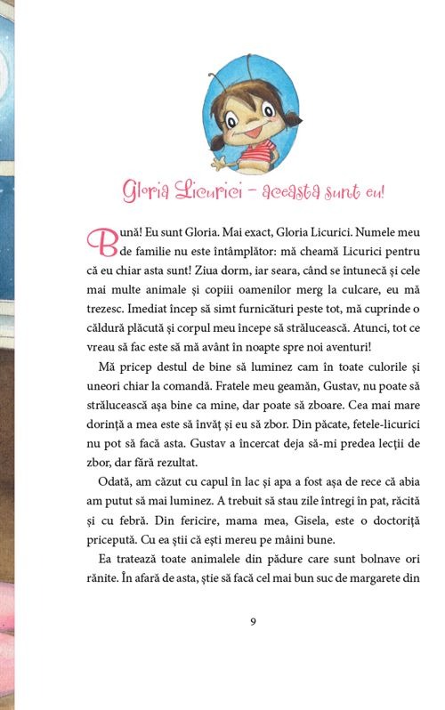 Bună! Eu sunt Gloria. Mai exact, Gloria Licurici. Numele meu de familie nu este întâmplător: mă cheamă Licurici pentru că eu chiar asta sunt! Ziua dorm, iar seara, când se întunecă, mă trezesc. Ador să merg noaptea prin pădurea noastră! E aşa de palpitant să descoperi tot ce se iveşte în calea ta!