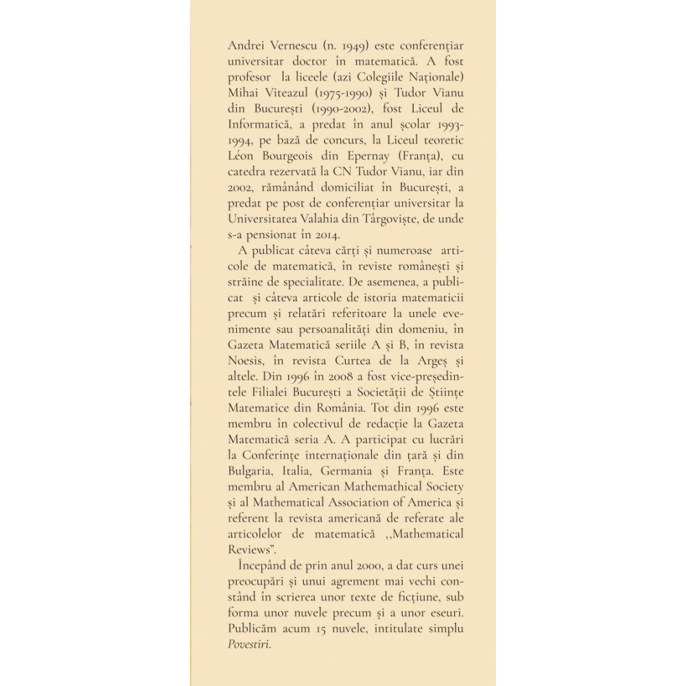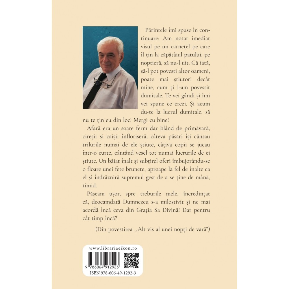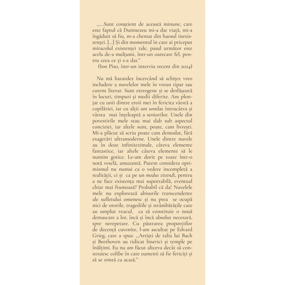 Nu mă hazardez încercând să schițez vreo includere a nuvelelor mele în vreun tipar sau curent literar. Sunt eterogene și se desfășoară în locuri, timpuri și medii diferite. Am plonjat cu unii dintre eroii mei în fericita vârstă a copilăriei, iar cu alții am sondat întrucâtva și vârsta mai înțeleaptă a seniorilor. Unele din povestirile mele stau mai slab sub aspectul conciziei, iar altele sunt, poate, cam livrești. Mi-a plăcut să scriu poate cam demodat, fără exagerări ultramoderne. Unele dintre nuvele au în doze infinitezimale, câteva elemente fantastice, iar altele câteva elemente să le numim gotice. Le-am dorit pe toate într-o notă veselă, amuzantă. Putem considera optimismul nu numai ca o vedere incompletă a realității, ci și ca pe un modus vivendi, pentru a ne face existența mai suportabilă, eventual chiar mai frumoasă? Probabil că da! Nuvelele mele nu explorează abisurile transcendente ale sufletului omenesc și nu prea se ocupă nici de ororile, tragediile și strâmbătățile care au umplut veacul, ca să constituie o nouă demascare a lor, încă și încă absolut necesară, spre nerepetare. Cu păstrarea proporțiilor de decență cuvenite, l-am ascultat pe Edvard Grieg, care a spus: ,,Artişti de talia lui Bach şi Beethoven au ridicat biserici şi temple pe înălţimi. Eu nu am făcut altceva decât să construiesc colibe în care oamenii să fie fericiţi şi să se simtă ca acasă.’’