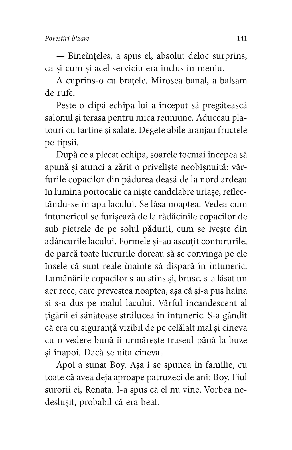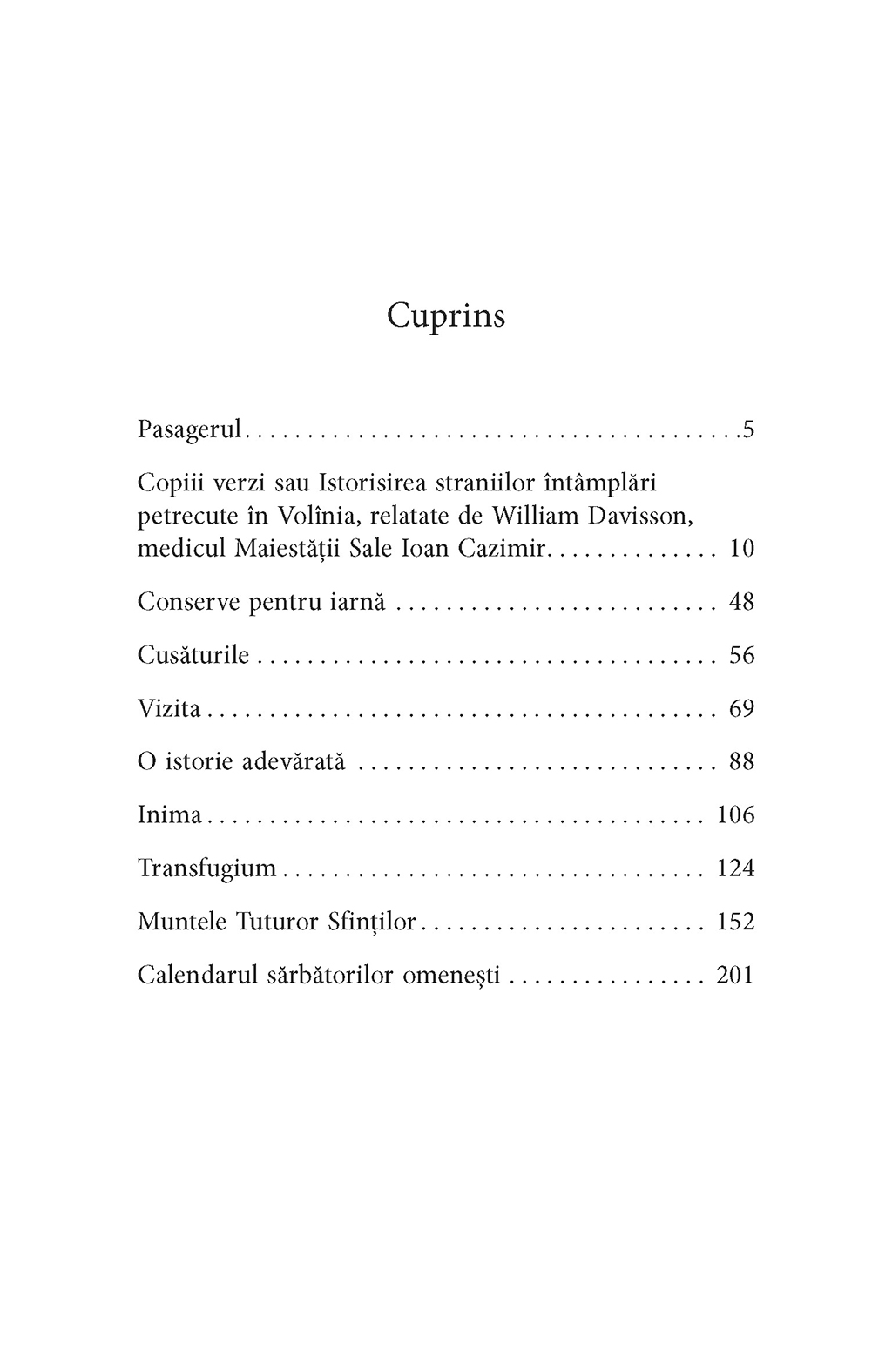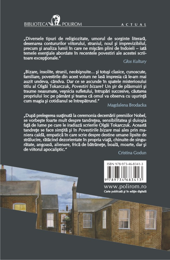 Un medic scoţian din secolul al XVII-lea, ajuns în slujba regelui Poloniei, descoperă o rasă ciudată de copii vegetali. O familie formată din patru femei identice primeşte vizita unui cuplu de bărbaţi similari. Un bătrîn văduv, însingurat şi tipicar, observă într-o dimineaţă că lumea din jur s-a transformat aleatoriu (sau, dacă nu, că şi-a pierdut el minţile). O lume degradată, dintr-un viitor nedefinit, îşi păstrează stabilitatea graţie sacrificiului unui personaj misterios, aparent nemuritor, ce suferă pentru oameni de peste trei sute de ani. În zece texte dense, pline de dinamism şi surprinzătoare de la premise pînă la final, imaginaţia neîngrădită ce caracterizează Povestirile bizare ale Olgăi Tokarczuk cucereşte nu doar prin subiecte ori prin atmosfera creată, ci şi prin forţa empatică ce le străbate. Pendulînd între fantastic, SF, straniu şi insolit, aceste povestiri reprezintă tot atîtea mostre de virtuozitate şi inventivitate artistică ale acestei remarcabile prozatoare.