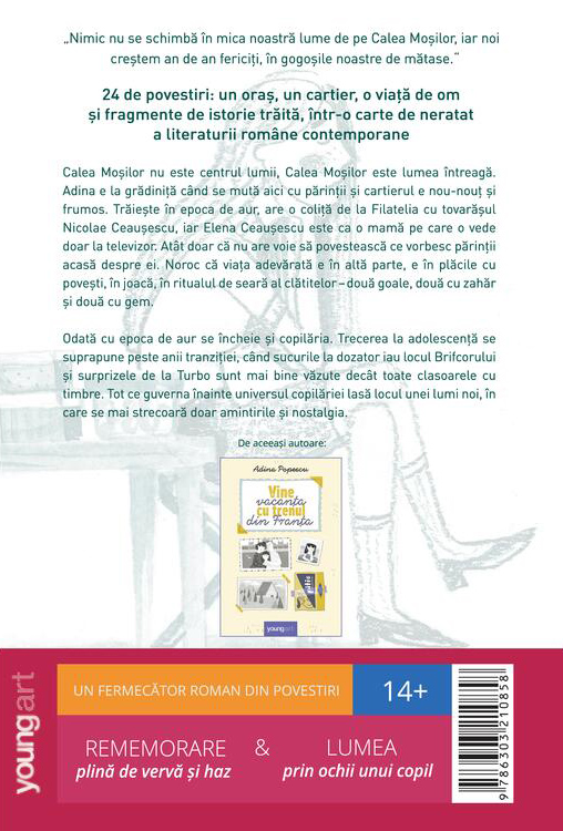 Calea Moșilor nu este centrul lumii, Calea Moșilor este lumea întreagă. Adina e la grădiniță când se mută aici, cu părinții, și cartierul e nou-nouț și frumos. Trăiește în epoca de aur, are o coliță de la Filatelia cu tovarășul Nicolae Ceaușescu, iar Elena Ceaușescu este ca o mamă pe care o vede doar la televizor. Atât doar că nu are voie să povestească ce vorbesc părinții acasă despre ei. Noroc că viața adevărată e în altă parte, e în plăcile cu povești, în joacă, în ritualul de seară al clătitelor – două goale, două cu zahăr și două cu gem.