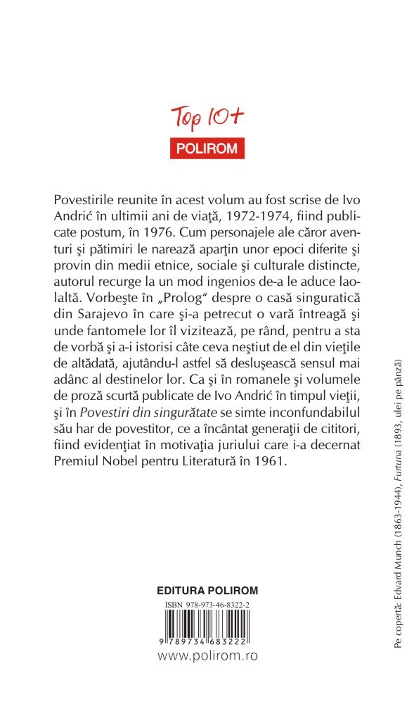 Povestirile reunite în acest volum au fost scrise de Ivo Andrić în ultimii ani de viaţă, 1972-1974, fiind publicate postum, în 1976. Cum personajele ale căror aventuri şi pătimiri le narează aparţin unor epoci diferite şi provin din medii etnice, sociale şi culturale distincte, autorul recurge la un mod ingenios de-a le aduce laolaltă. Vorbeşte în „Prolog” despre o casă singuratică din Sarajevo în care şi-a petrecut o vară întreagă şi unde fantomele lor îl vizitează, pe rînd, pentru a sta de vorbă şi a-i istorisi cîte ceva neştiut de el din vieţile de altădată, ajutîndu-l astfel să desluşească sensul mai adînc al destinelor lor. Ca şi în romanele şi volumele de proză scurtă publicate de Ivo Andrić în timpul vieţii, şi în Povestiri din singurătate se simte inconfundabilul său har de povestitor, ce a încîntat generaţii de cititori, fiind evidenţiat în motivaţia juriului care i-a decernat Premiul Nobel pentru Literatură în 1961.