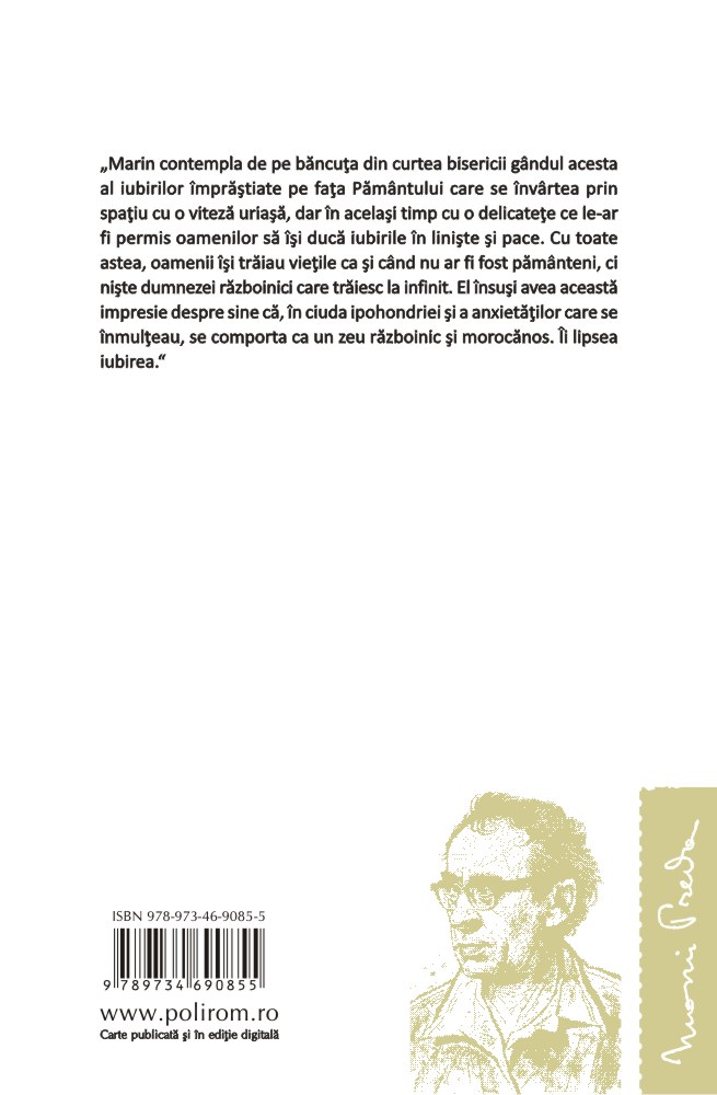 „Marin contempla de pe băncuţa din curtea bisericii gândul acesta al iubirilor împrăştiate pe faţa Pământului care se învârtea prin spaţiu cu o viteză uriaşă, dar în acelaşi timp cu o delicateţe ce le-ar fi permis oamenilor să îşi ducă iubirile în linişte şi pace. Cu toate astea, oamenii îşi trăiau vieţile ca şi când nu ar fi fost pământeni, ci nişte dumnezei războinici care trăiesc la infinit. El însuşi avea această impresie despre sine că, în ciuda ipohondriei şi a anxietăţilor care se înmulţeau, se comporta ca un zeu războinic şi morocănos. Îi lipsea iubirea.”