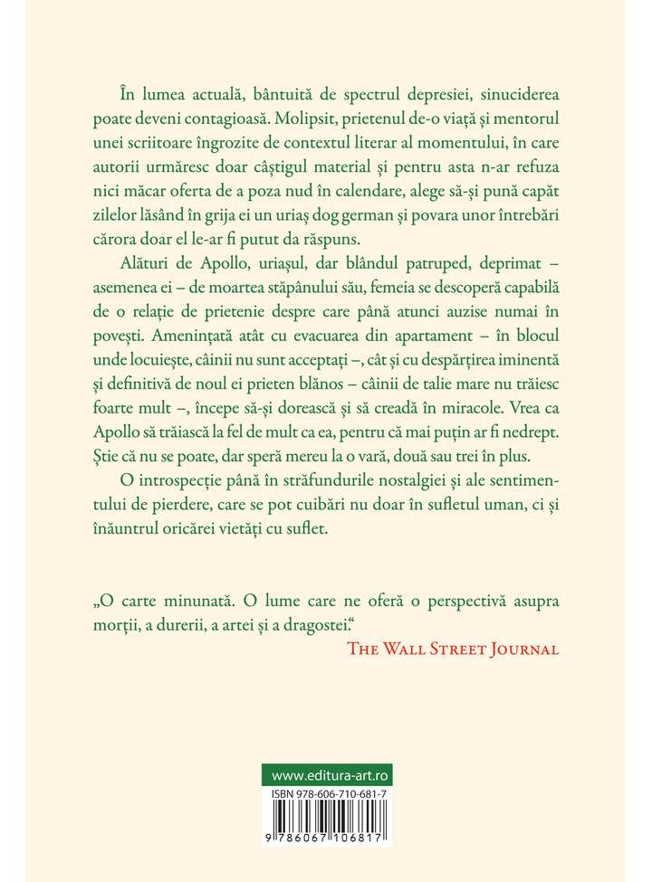 În lumea actuală, bântuită de spectrul depresiei, sinuciderea poate deveni contagioasă. Molipsit, prietenul de-o viață și mentorul unei scriitoare îngrozite de contextul literar al momentului, în care autorii urmaresc toate câștigul material și pentru asta n-ar refuza nici măcar oferta de a poza nud în calendare, alege să-și pună capăt zilelor lăsând în grija ei un uriaș dog german și povara unor întrebări cărora doar el le-ar fi putut da răspuns.