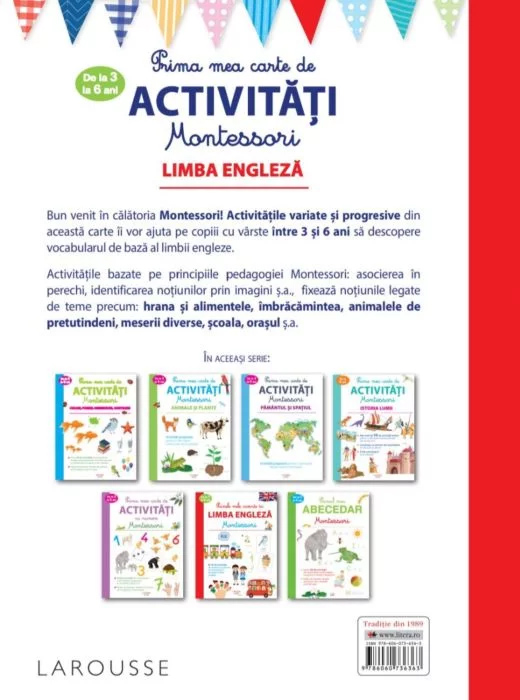 Bun venit în călătoria Montessori! Activitățile variate și progresive din această carte îi vor ajuta pe copiii cu vârste între 3 și 6 ani să descopere vocabularul de bază al limbii engleze.