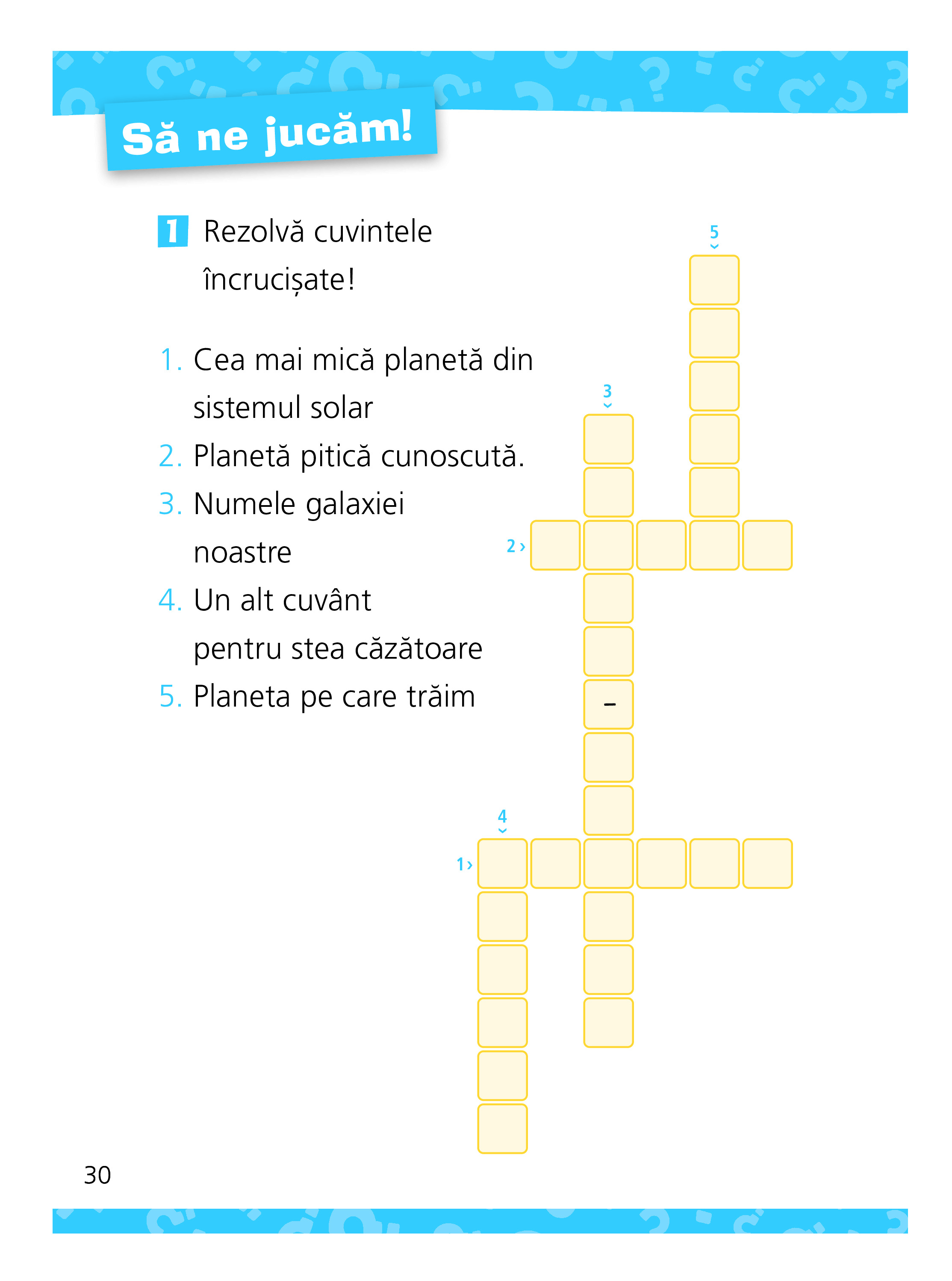 Pe lângă informații, date și povești despre spațiul cosmic, secțiunile „Să ne jucăm!” de la sfrșitul fiecărui capitol, le propun celor mici joculețe ingenioase, enigme, cuvinte încurcișate și abțibilduri care îi vor ajuta să însușească în mod interactiv informațiile din carte.