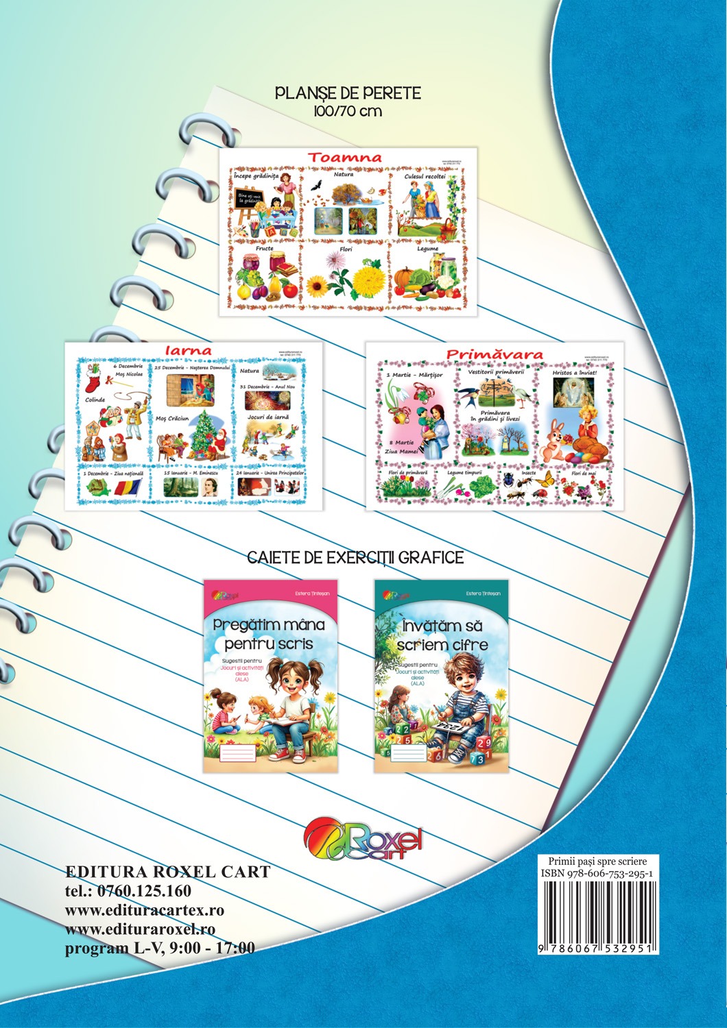 Primii pasi spre scriere este un caiet educativ si interactiv, realizat in conformitate cu programa aprobata de M.E.N. pentru invatamantul prescolar. Caietul de antrenament grafic este special conceput pentru copiii prescolari care isi fac primele exercitii de scriere. In primul rand, acest caiet de antrenament grafic ofera o varietate de exercitii grafice progresive, care ajuta copiii sa isi dezvolte abilitatile motorii fine si sa invete sa controleze creionul. De la punct, linii simple, curbe la forme de baza , fiecare exercitiu este adaptat pentru a stimula invatarea intr-un mod distractiv si accesibil.