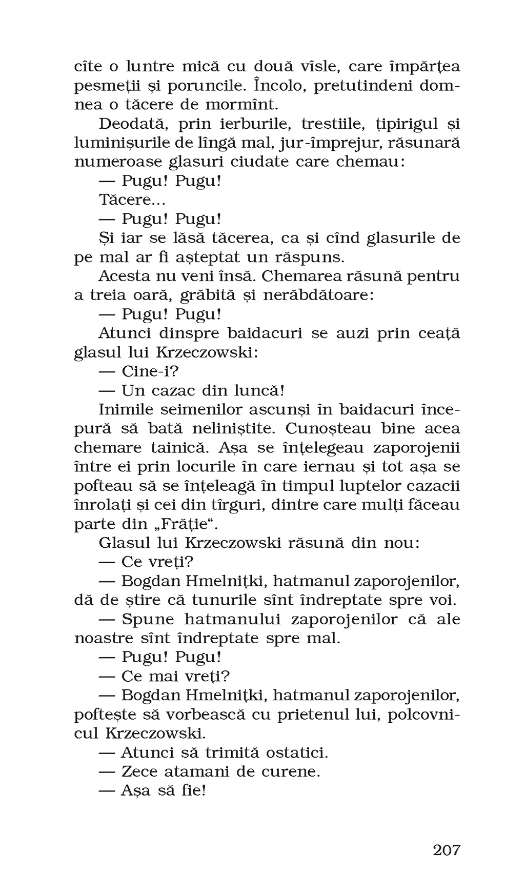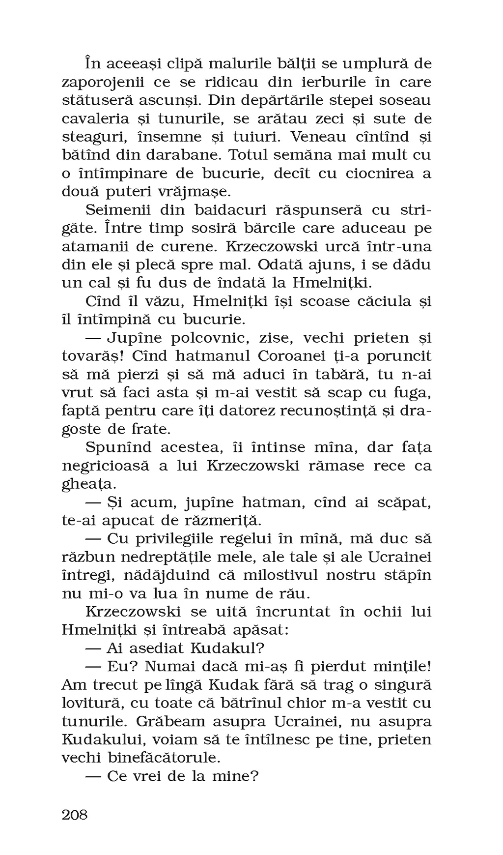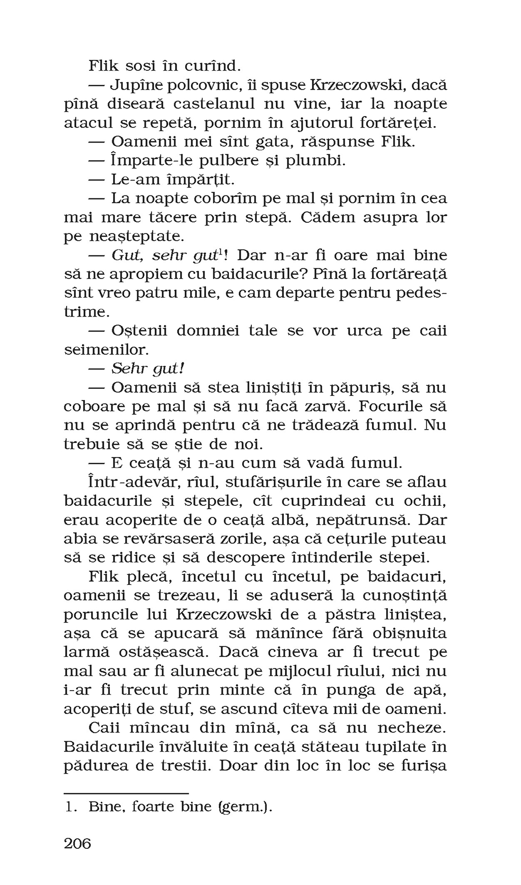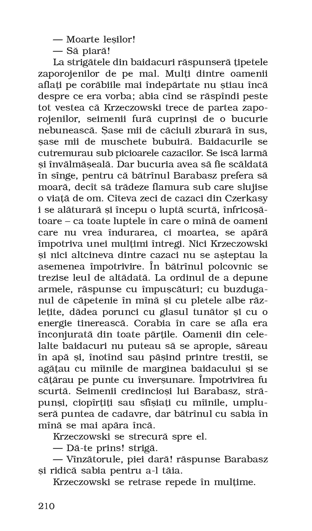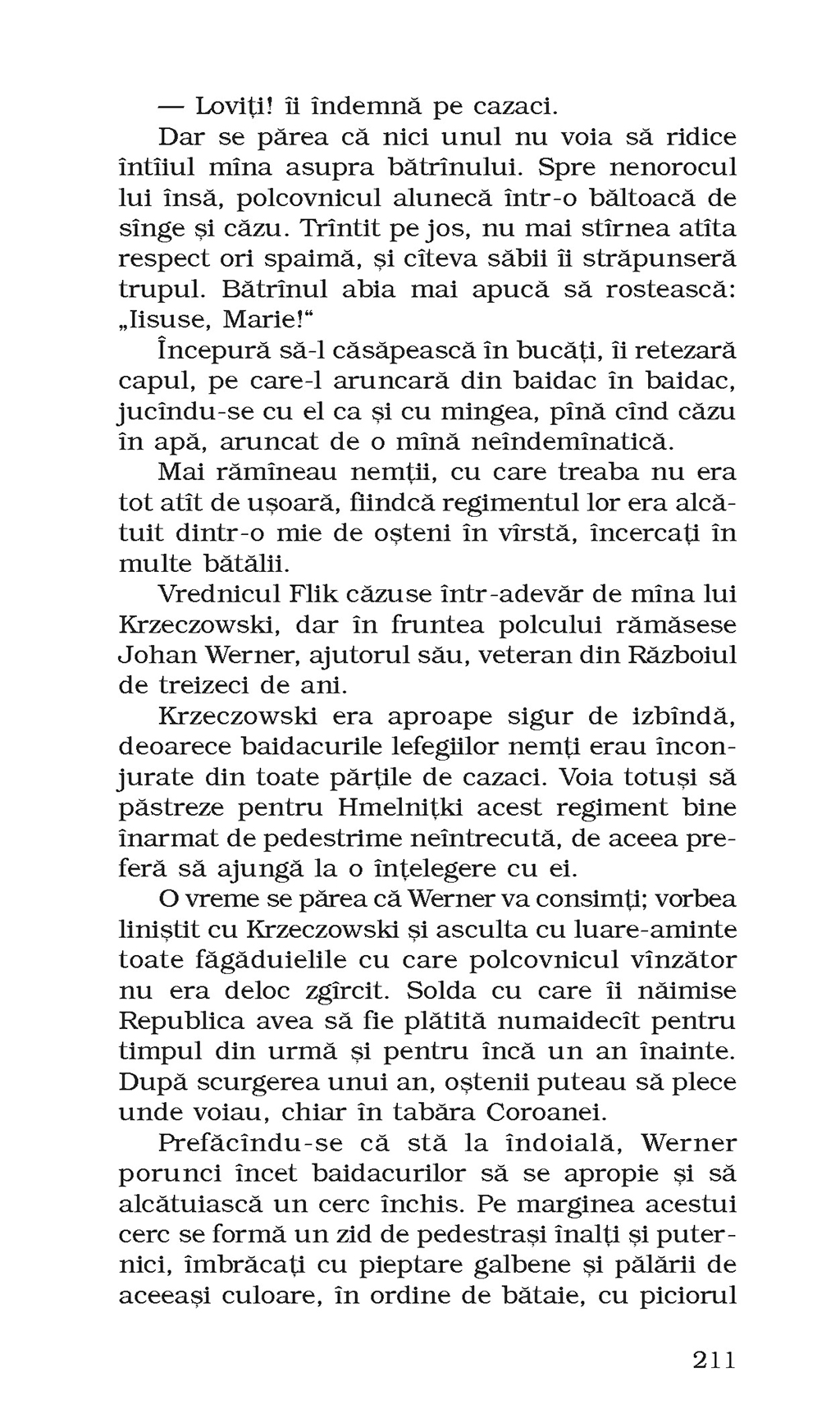 „Oamenii se mişcară, un vifor învioră parcă mulţimea de oşteni, apoi se iscară deodată murmure. Cuvintele «Vine oastea!» zburară ca o săgeată de la un capăt al întăriturilor la celălalt. Luptătorii începură să se îmbulzească, să se împingă, să se frămînte. Murmurul aici creştea, aici se potolea, toate mîinile făceau streaşină ochilor, toate privirile erau aţintite cu încordare în depărtare şi inimile băteau să se spargă. Se uitau cu toţii, ţinîndu‑şi răsuflarea, pradă îndoielii şi nădejdii. Deodată, sub arcul multicolor sclipi ceva care devenea tot mai limpede; ieşea din ceaţa depărtărilor, se apropia din ce în ce mai mult şi se vedea din ce în ce mai bine, pînă cînd, în cele din urmă, se arătară pîlcuri, stindarde, tuiuri, apoi o pădure de steguleţe şi ochii nu se mai îndoiră; erau oşteni.”