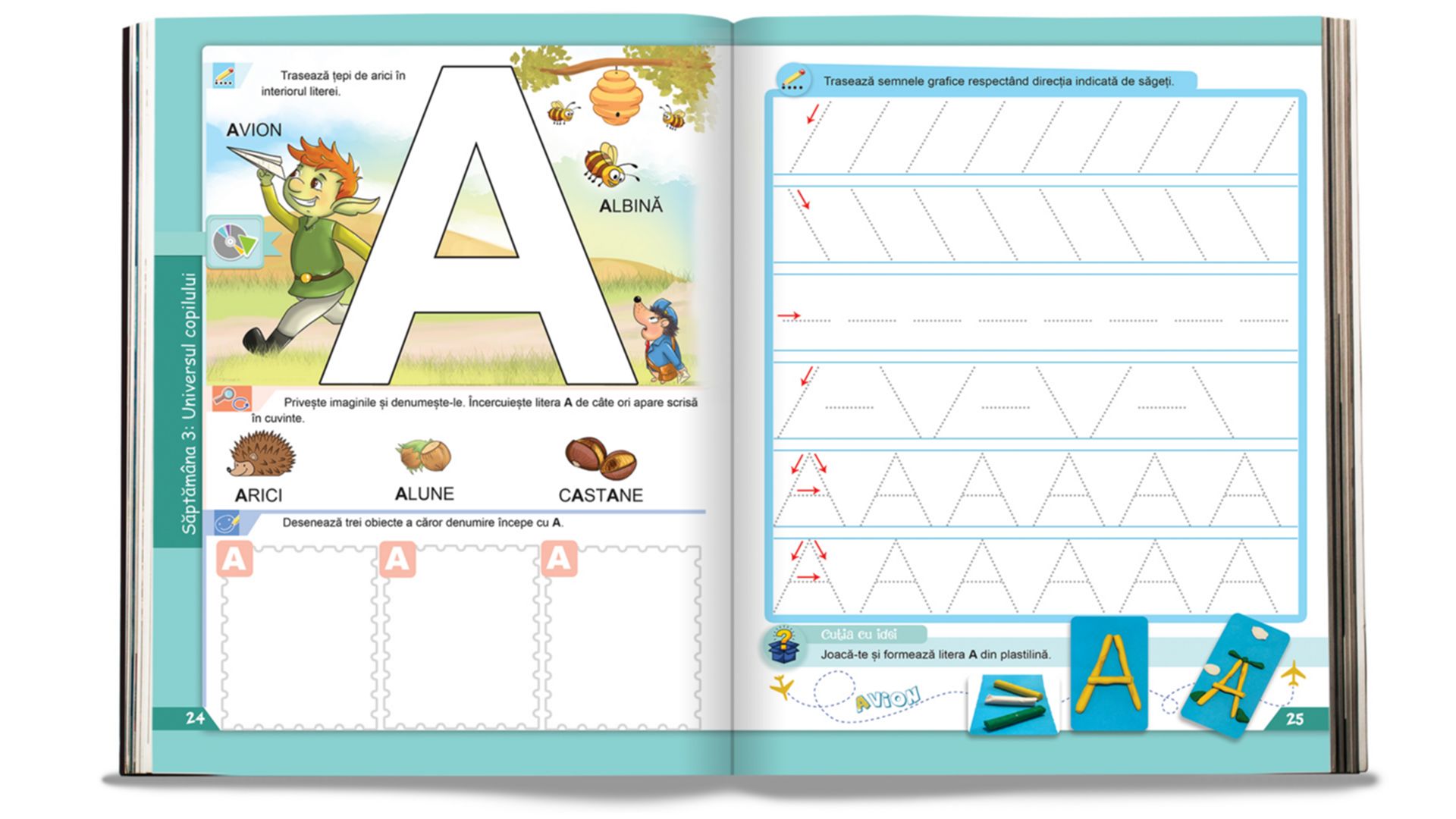 Elaborat intr-o maniera inovativa si moderna, acest caiet imbina armonios toate domeniile experientiale in pagini pline de personaje simpatice, exercitii amuzante, activitati practice, benzi desenate si o multime de surprize educative.