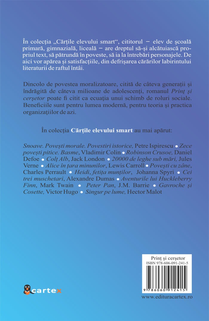 Dincolo de povestea moralizatoare, citita de cateva generatii si indragita de cateva milioane de adolescenti, romanul Print si cersetor poate fi citit ca ecuatia unui schimb de roluri sociale. Beneficiile sunt pentru lumea moderna, pentru teoria si practica organizatiilor de azi. - Lucian Pricop