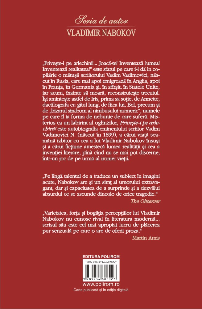„Privește-i pe arlechini!... Joacă-te! Inventează lumea! Inventează realitatea!” este sfatul pe care i-l dă în copilărie o mătușă scriitorului Vadim Vadimovici, născut în Rusia, care mai apoi emigrează în Anglia, apoi în Franța, în Germania și, în sfîrșit, în Statele Unite, iar acum, înainte să moară, reconstruiește trecutul. Își amintește astfel de Iris, prima sa soție, de Annette, dactilografa cu gîtul lung, de fiica lui, Bel, precum și de „bizarul sindrom al nimbusului numeric”, numele pe care îl ia forma de nebunie de care suferă. Misterios ca un labirint al oglinzilor, Privește-i pe arlechini! este autobiografia eminentului scriitor Vadim Vadimovici N. (născut în 1899), a cărui viață seamănă izbitor cu cea a lui Vladimir Nabokov însuși și a cărui ficțiune amestecă lumea realității și cea a invenției literare, pînă cînd nu se mai pot discerne, într-un joc de pe urmă al ironiei vieții.