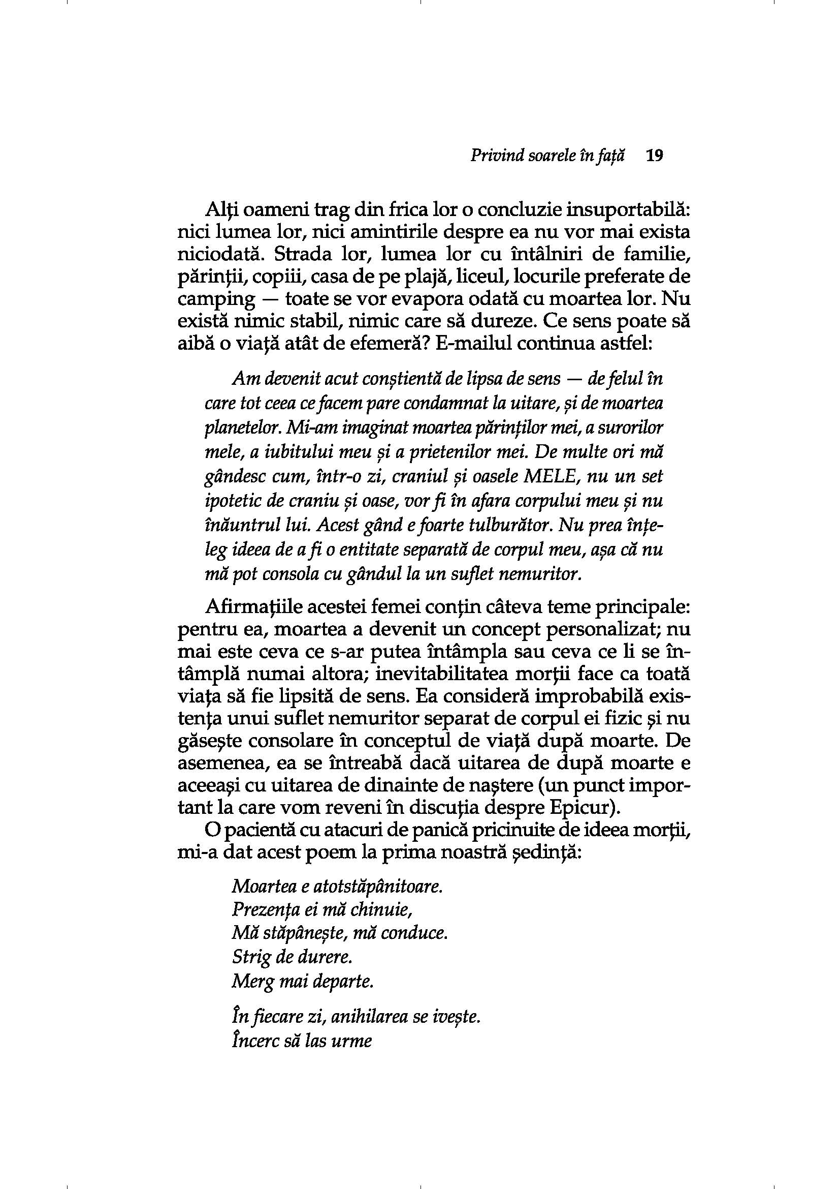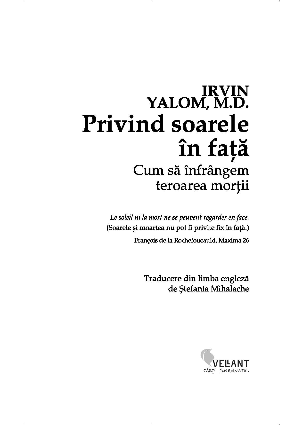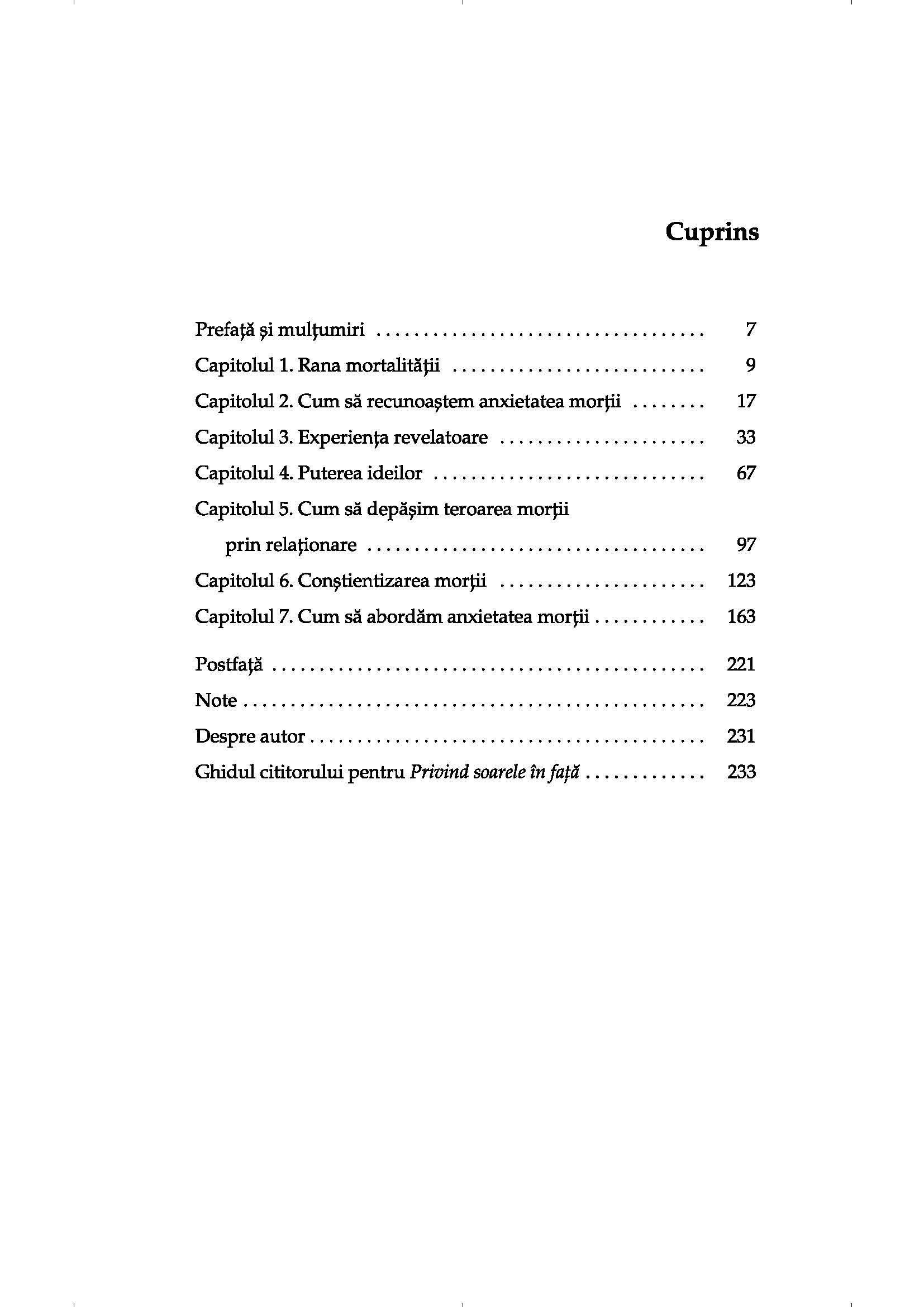 O carte profund personală, izvorâtă din confruntarea autorului cu ideea morţii, Privind soarele în faţă ne priveşte pe fiecare dintre noi, punându-ne înaintea acestui subiect tabu, dar de neocolit: propria moarte.