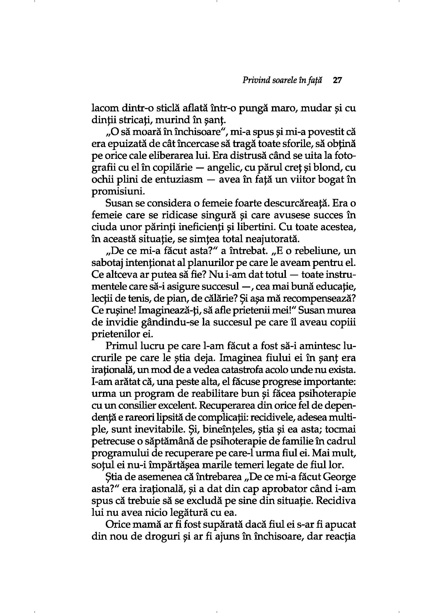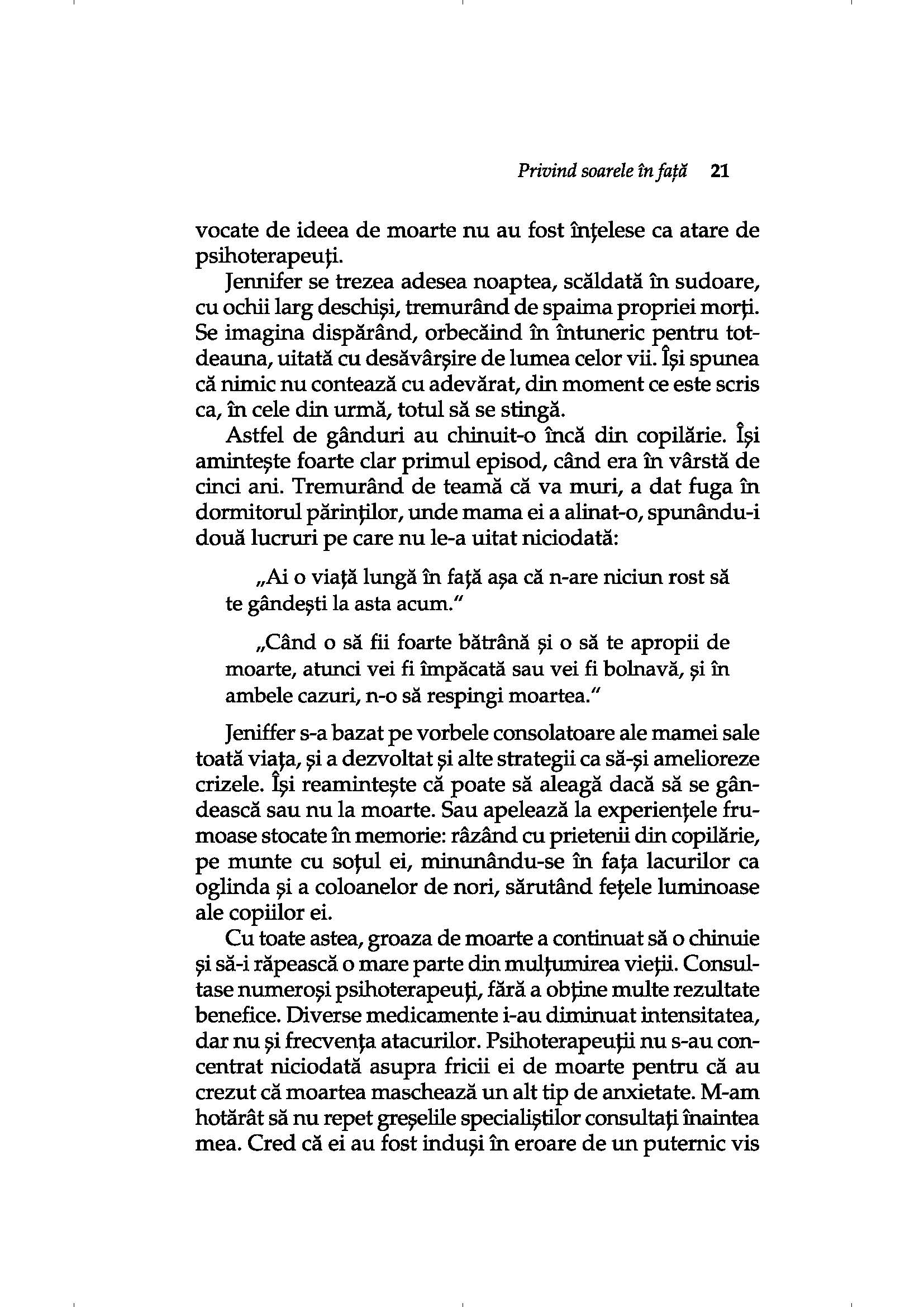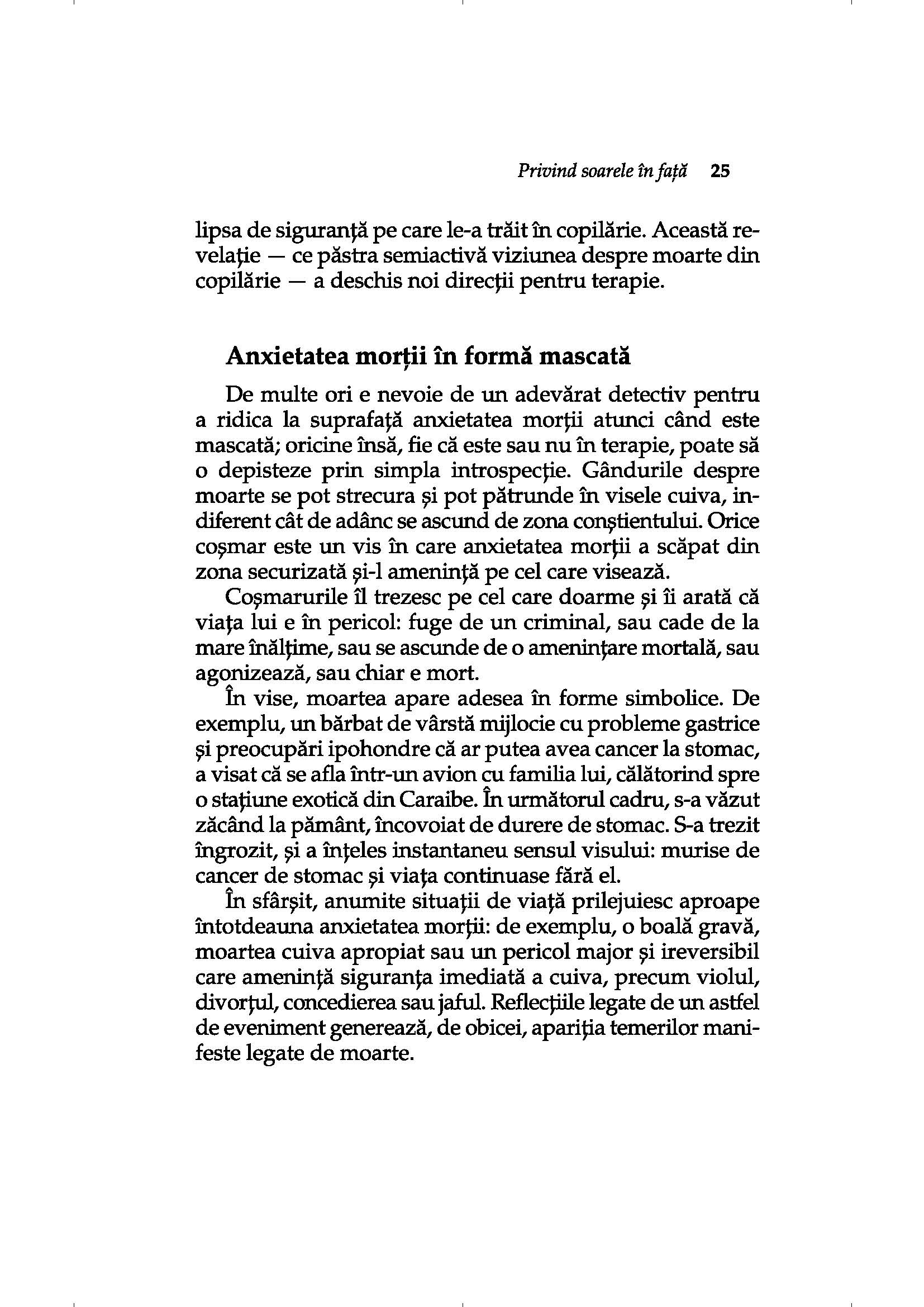 O carte profund personală, izvorâtă din confruntarea autorului cu ideea morţii, Privind soarele în faţă ne priveşte pe fiecare dintre noi, punându-ne înaintea acestui subiect tabu, dar de neocolit: propria moarte.