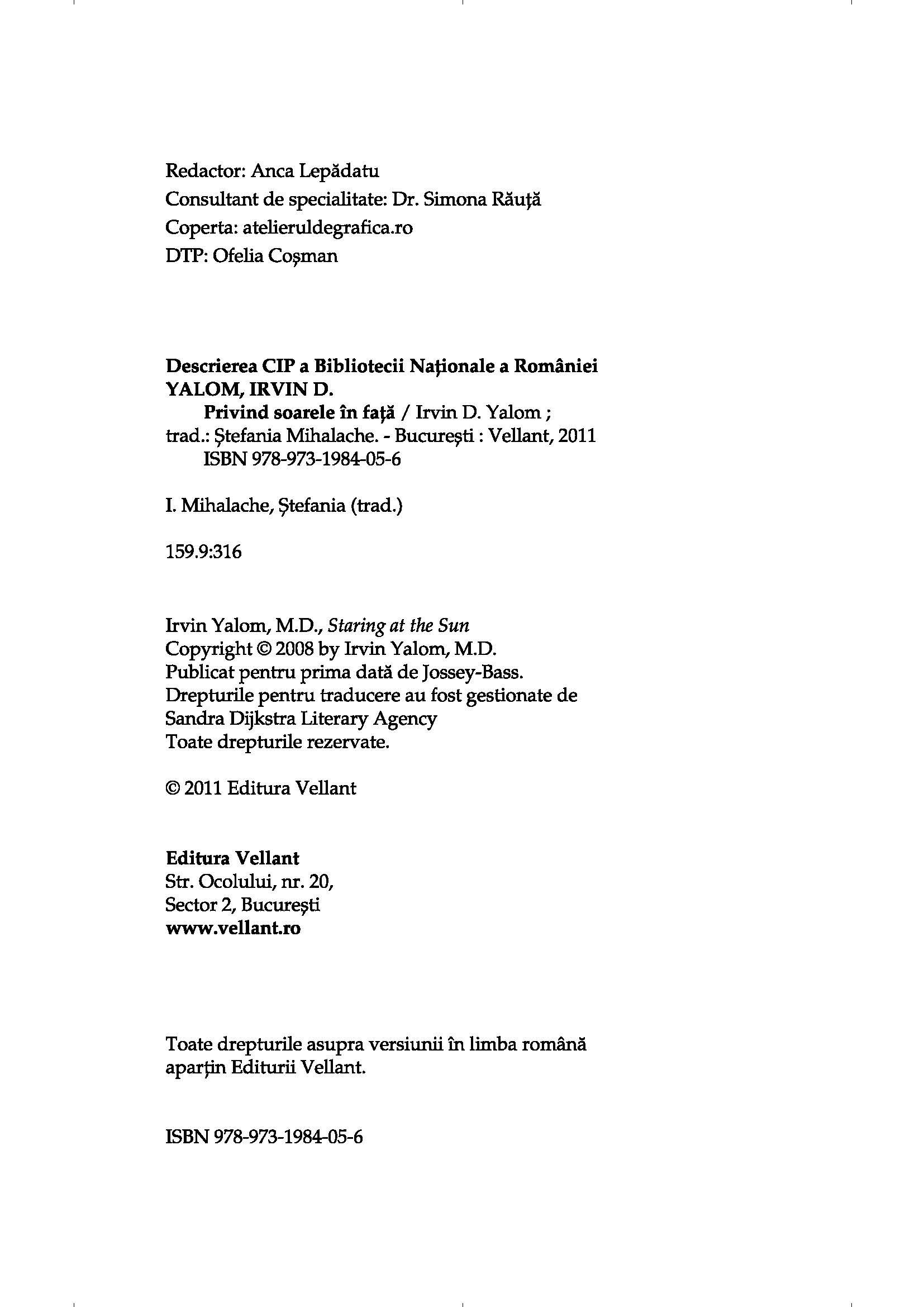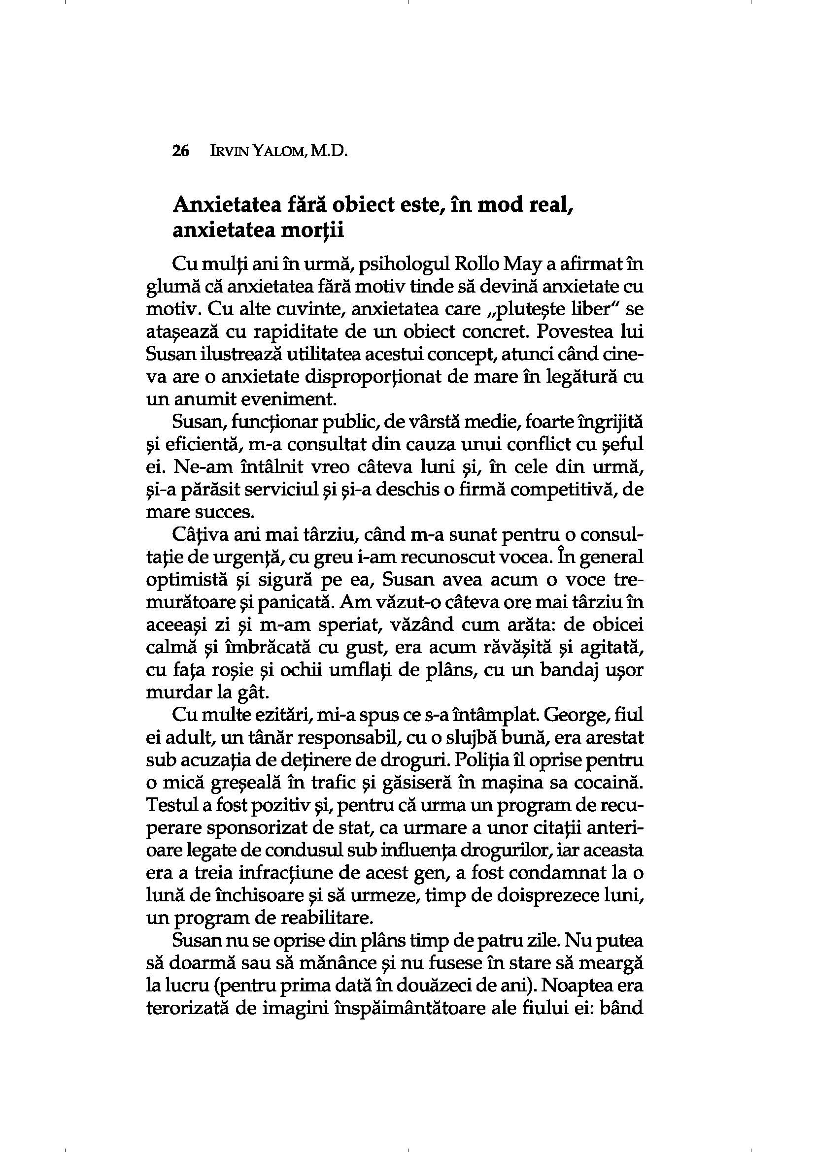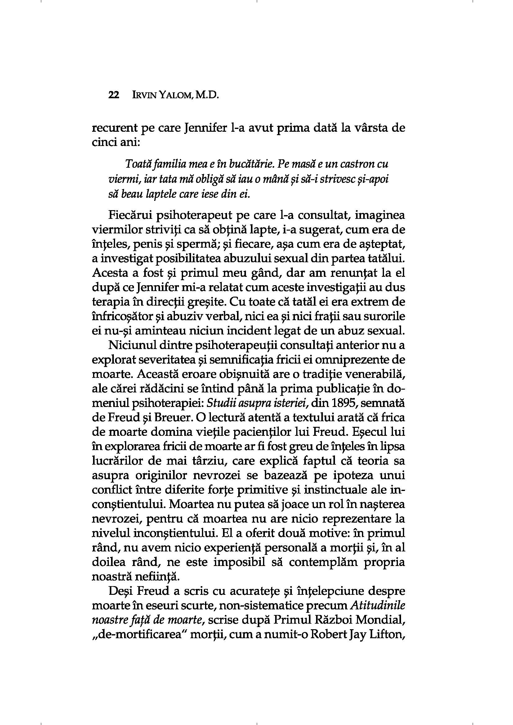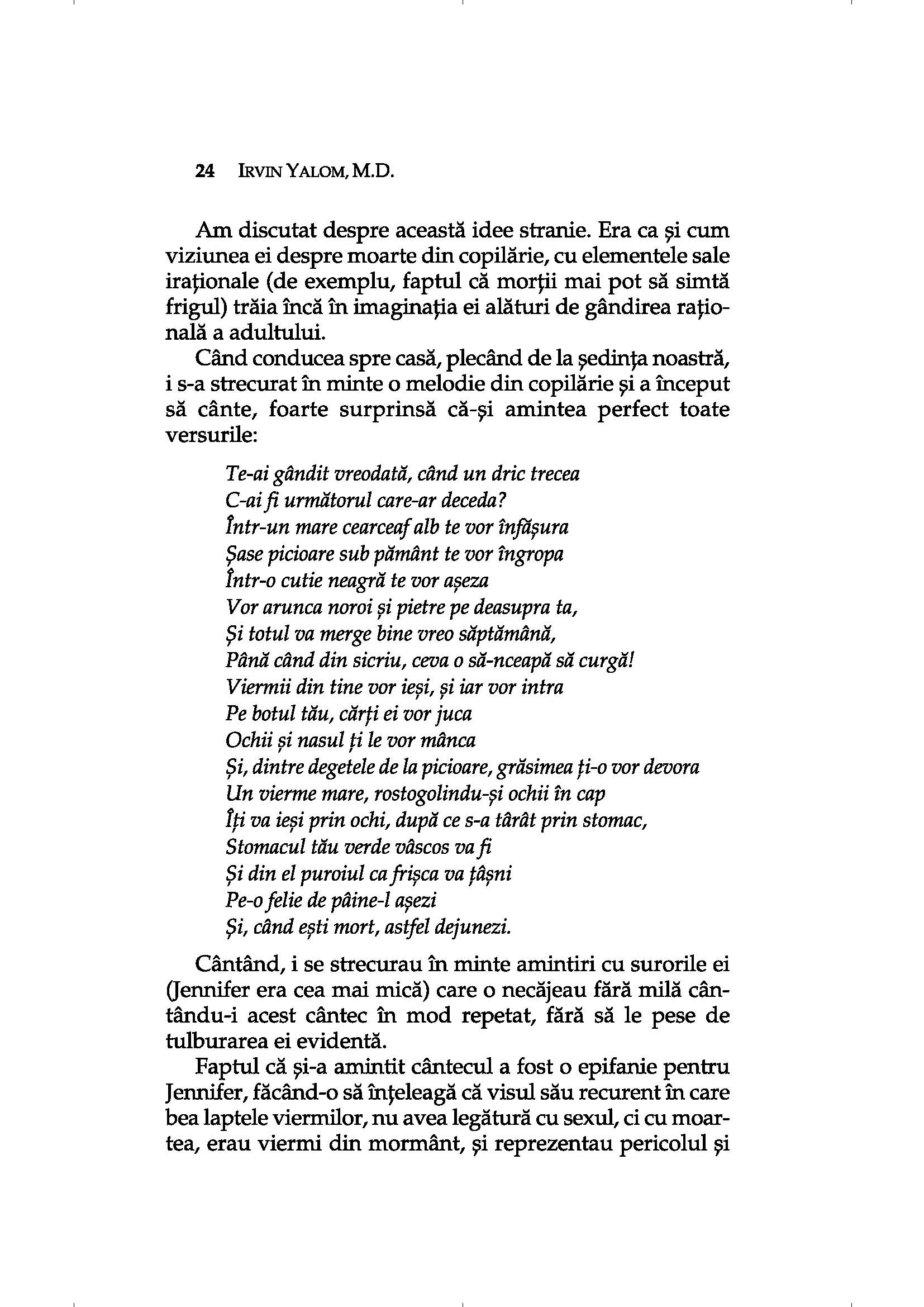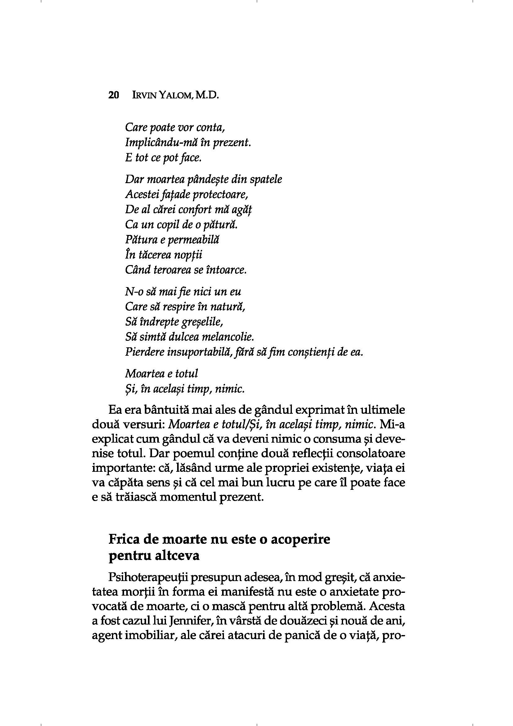 Arătându-ne nu cum să înfrângem teama de moarte, ci cum să devenim îndeajuns de înţelepţi pentru a o înţelege şi a o tolera, Irvin Yalom dă naştere unei cărţi indispensabile celor aflaţi în căutarea armoniei în viaţă.