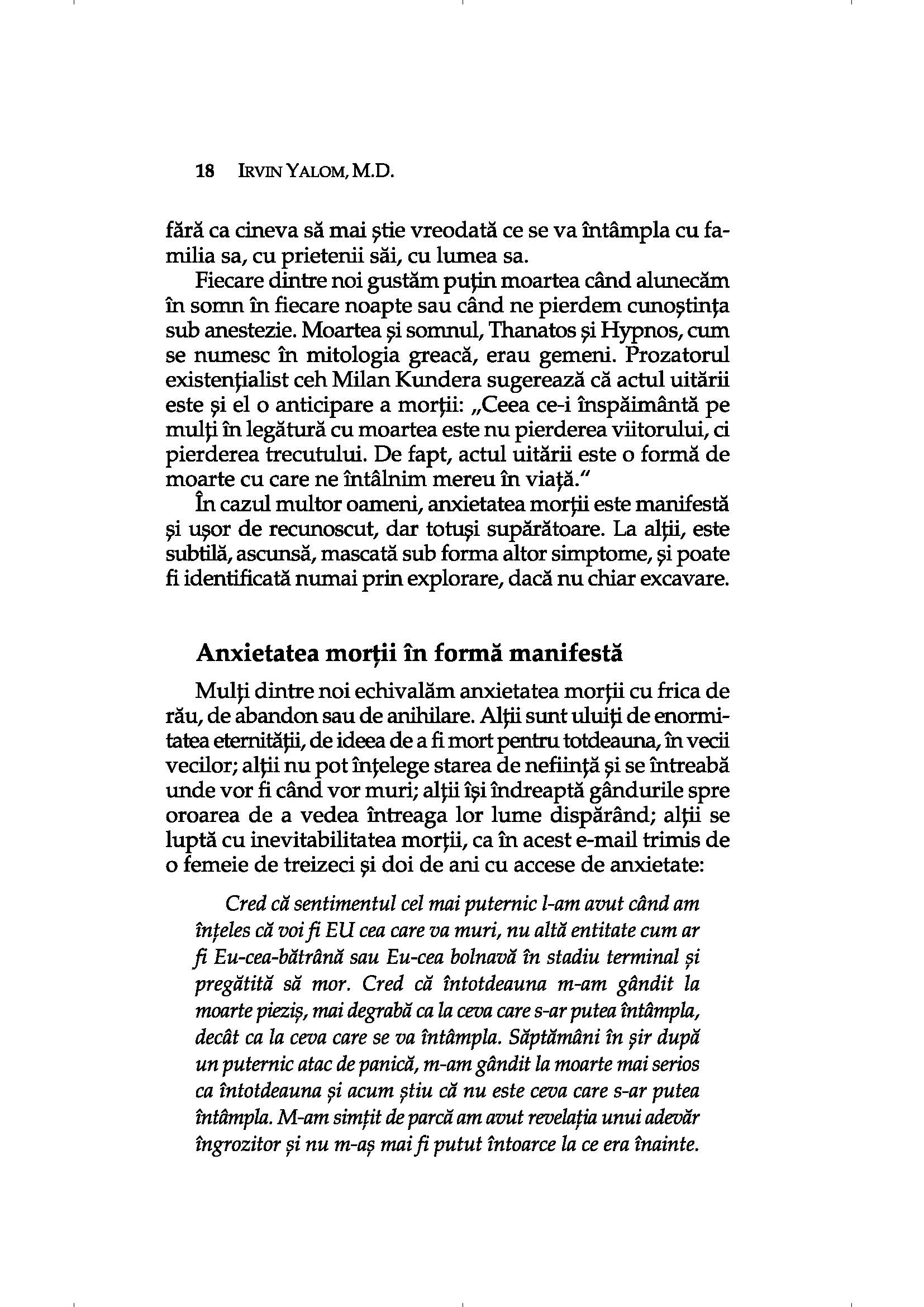 Odată confruntaţi cu ideea propriei morţi, scrie Irvin Yalom, suntem inspiraţi să ne rearanjăm priorităţile, să comunicăm mai profund cu cei pe care îi iubim, să ne bucurăm intens de frumuseţea vieţii şi suntem dispuşi să riscăm mai mult pentru a ne simţi împliniţi.