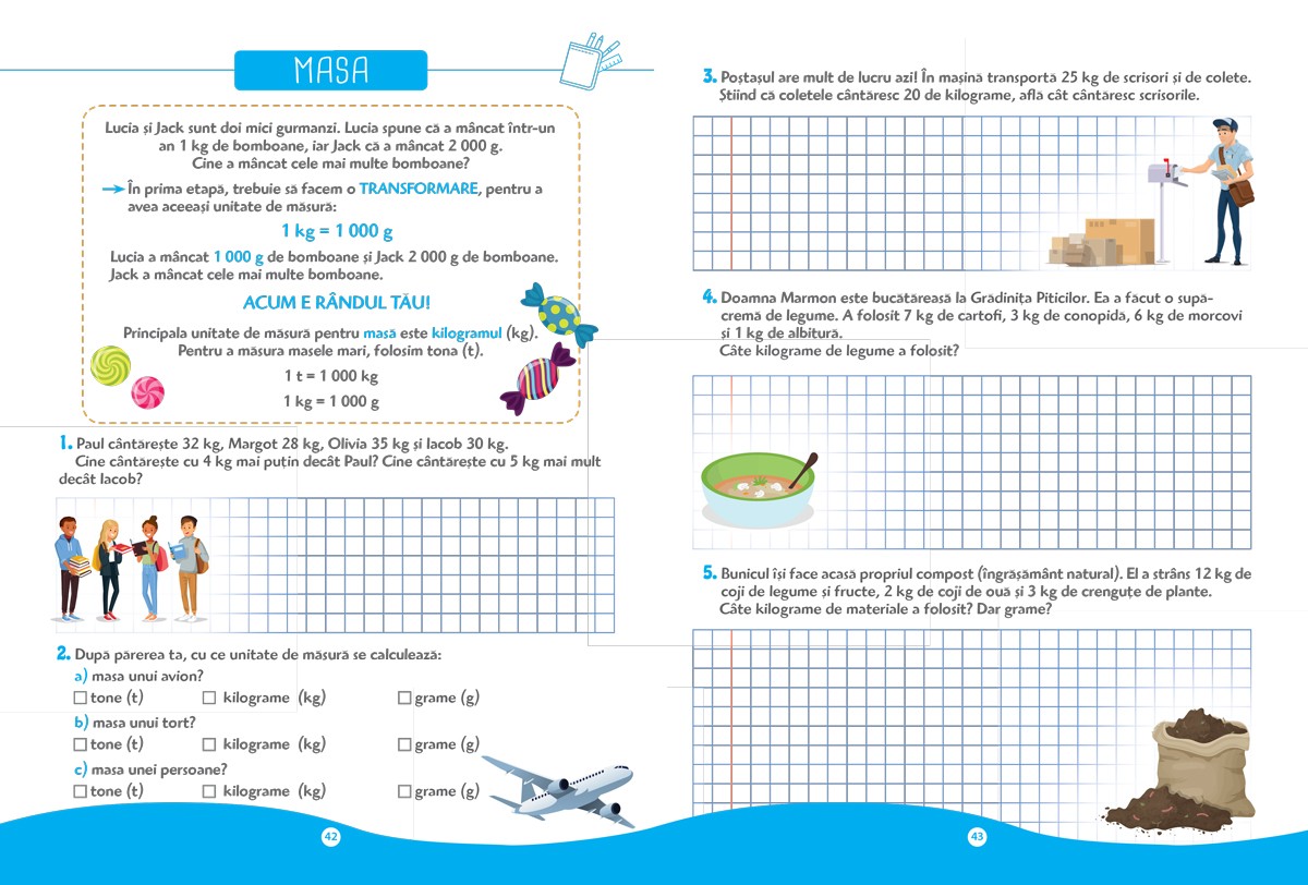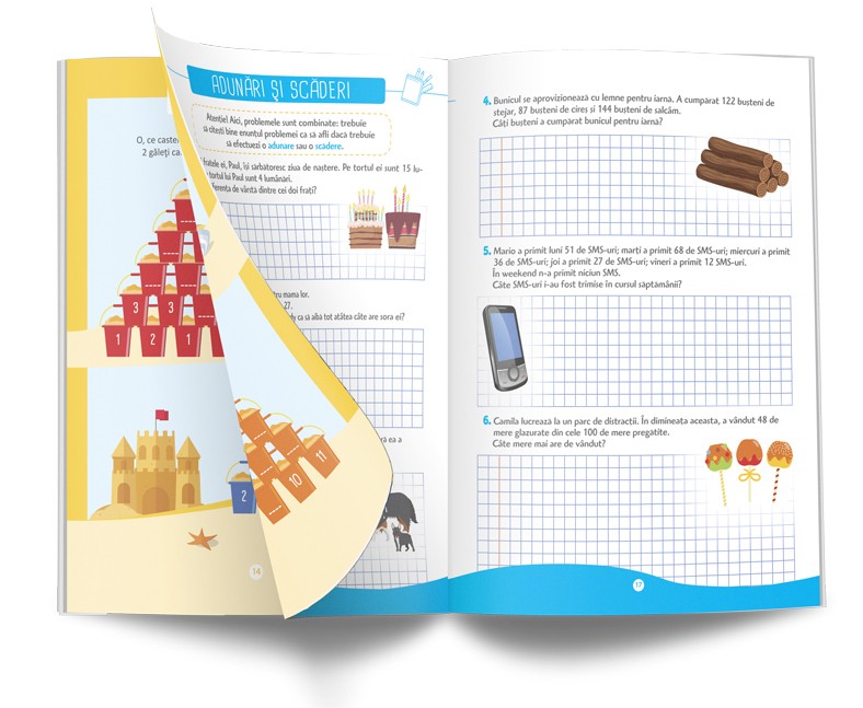 Problemele sunt de dificultate progresivă și te ajută să abordezi corect toate tipurile de probleme cu adunări, scăderi, înmulțiri și împărțiri.