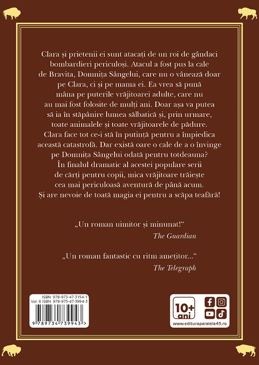 Clara și prietenii ei sunt atacați de un roi de gândaci bombardieri periculoși. Atacul a fost pus la cale de Bravita, Domnița Sângelui, care nu o vânează doar pe Clara, ci și pe mama ei. Ea vrea să pună mâna pe puterile vrăjitoarei adulte, care nu au mai fost folosite de mulți ani. Doar așa va putea să ia în stăpânire lumea sălbatică și, prin urmare, toate animalele și toate vrăjitoarele de pădure. Clara face tot ce-i stă în putință pentru a împiedica această catastrofă. Dar există oare o cale de a o învinge pe Domnița Sângelui odată pentru totdeauna? În finalul dramatic al acestei populare serii de cărți pentru copii, mica vrăjitoare trăiește cea mai periculoasă aventură de până acum. Și are nevoie de toată magia ei pentru a scăpa teafără!