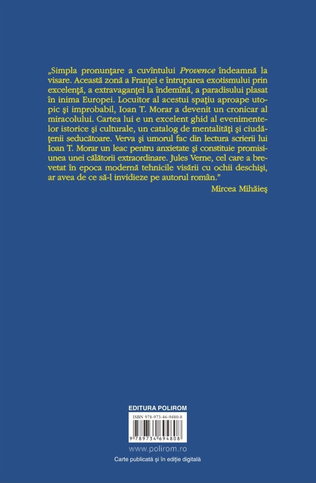 „Simpla pronunțare a cuvântului Provence îndeamnă la visare. Această zonă a Franței e întruparea exotismului prin excelență, a extravaganței la îndemână, a paradisului plasat în inima Europei. Locuitor al acestui spațiu aproape utopic și improbabil, Ioan T. Morar a devenit un cronicar al miracolului. Cartea lui e un excelent ghid al evenimentelor istorice și culturale, un catalog de mentalități și ciudățenii seducătoare. Verva și umorul fac din lectura scrierii lui Ioan T. Morar un leac pentru anxietate și constituie promisiunea unei călătorii extraordinare. Jules Verne, cel care a brevetat în epoca modernă tehnicile visării cu ochii deschiși, ar avea de ce să-l invidieze pe autorul român.” (Mircea Mihăieș)
