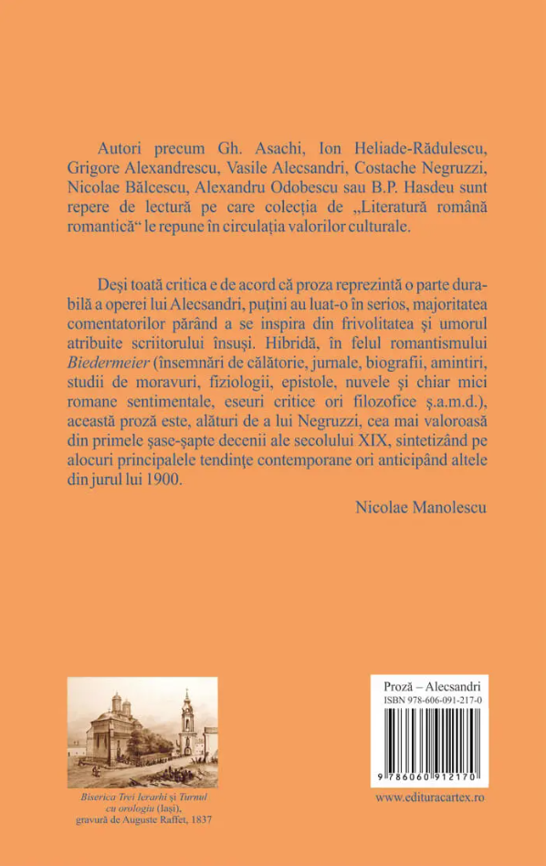 Proza lui Alecsandri trece drept partea cea mai viabila a literaturii sale, in sensul ca se deschide cititorilor de astazi chiar peste considerentele istorice care pot conferi anumitor texte un interes ce amesteca preocuparile de stiinta cu bunavointa estetica specioasa. […] Lui Alecsandri ii place sa fie ascultat, fara sa abuzeze de artificii pretentioase ale oralitatii: pitorescul material, tematic se acopera de o fina panza transparenta de ironie care nu e decat humor bland, incantare la aspectele lumii si ale vietii. El petrece cuviincios, ca un patriot epicurian, la vederea naturii umane si fizice, mizeriile si frumusetile, regretul si induiosarea desfoliindu-se de la conturul minutios fara pedanterie la grotesc.