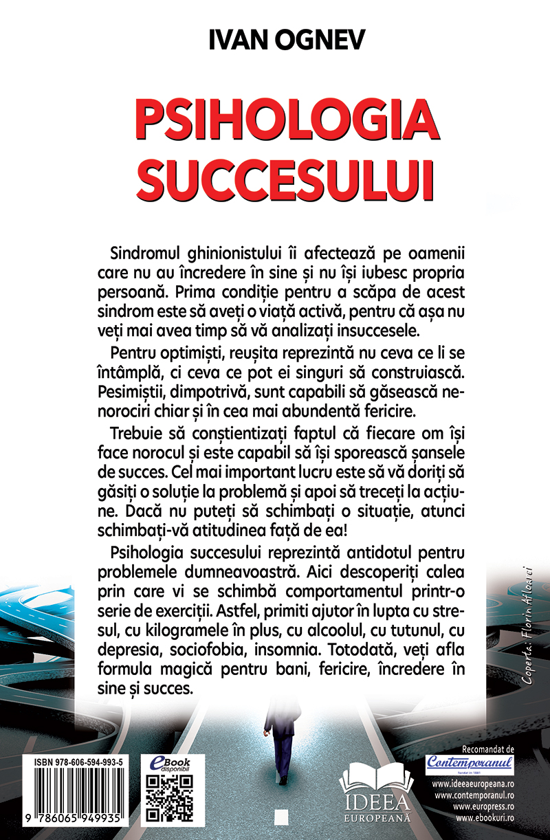 Psihologia succesului reprezintă antidotul pentru problemele dumneavoastră. Aici descoperiți calea prin care vi se schimbă comportamentul printr-o serie de exerciții. Astfel, primiți ajutor în lupta cu stresul, cu kilogramele în plus, cu alcoolul, cu tutunul, cu depresia, sociofobia, insomnia. Totodată, veți afla formula magică pentru bani, fericire, încredere în sine și succes.