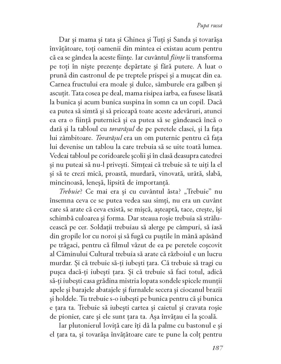 Nu mi-am propus prin Pupa russa să scriu un roman politic sau să fac panorama socială a unei perioade istorice (comunismul românesc). Pupa russa nu este neapărat un roman narativ. El nu urmărește un destin, ci simptomele și devenirea unui caz individual. Leontina, personajul principal al romanului, e o existență în derivă, dar și o viață condamnată. (Gheorghe Crăciun)