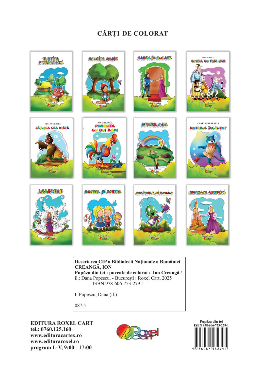 Cartea de colorat „Pupaza din tei” este o adaptare incantatoare pentru copii, dar care pastreaza in acelasi timp farmecul original al povestirii lui Ion Creanga. Aceasta ofera copiilor o oportunitate de a explora si a colora scene memorabile din poveste, in timp ce se bucura de mesajul moral.