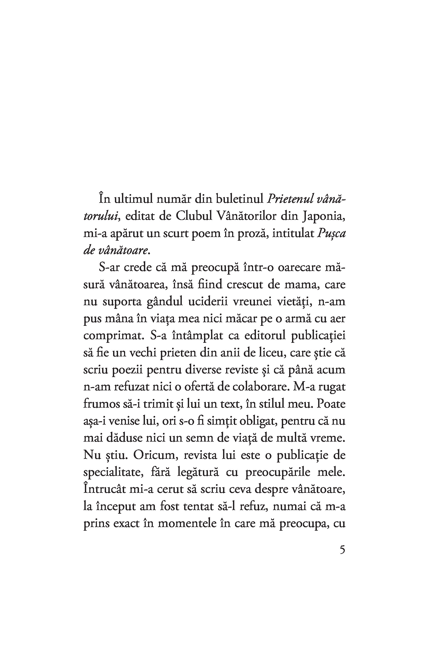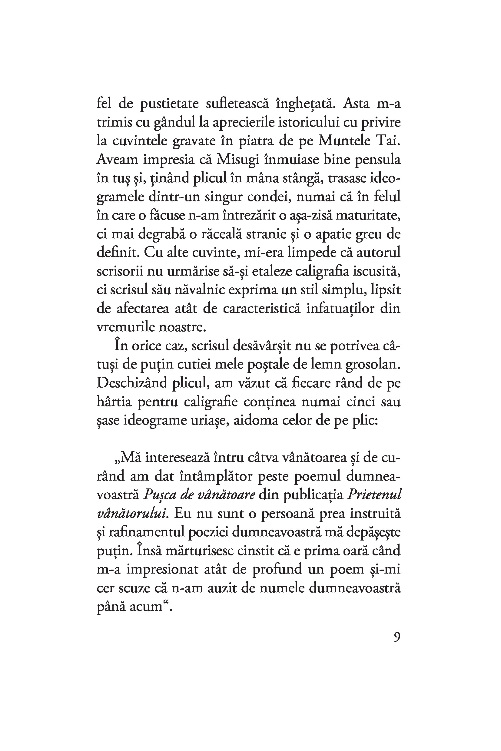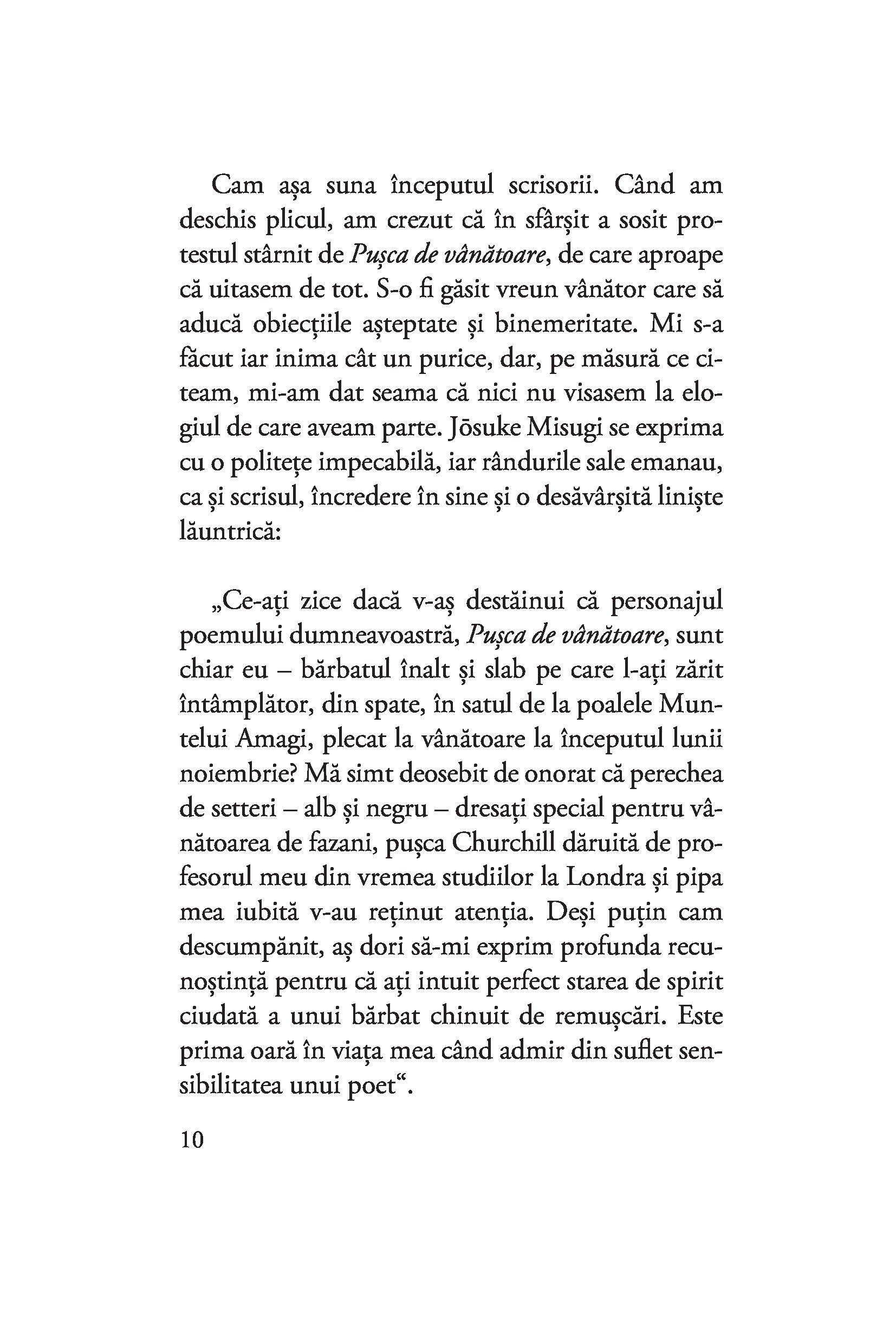 Este oare cu putință ca o pușcă de vânătoare dintr-un poem apărut într-o revistă cinegetică să lege patru destine? Poate să ucidă o pușcă pe trăgaciul căreia nu apasă nimeni? De ce moare altcineva decât femeia luată în cătarea armei? Cine e vânatul și cine vânătorul? Cum poate fi apărată cu pușca o amintire? Ce se întâmplă când un jurnal nu este aruncat în foc? Dar atunci când scrisorile rănesc mai tare decât gloanțele? Cititorul nu trebuie să îmbrace un chimono ca să poată răspunde la toate aceste întrebări. E suficient să-și lase deoparte ochelarii de european și să pătrundă liniștit în această nespus de frumoasă lume a sugestiilor.