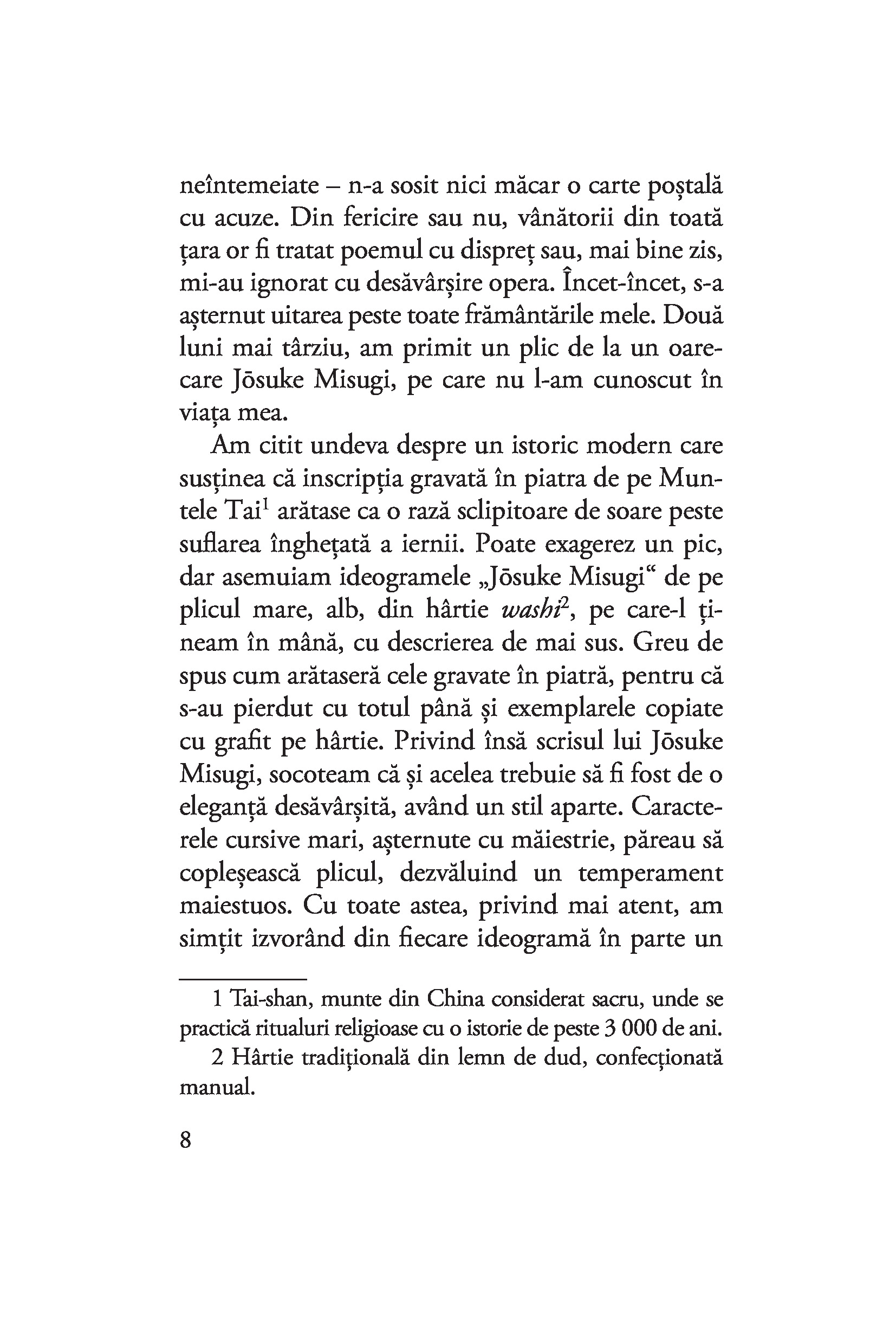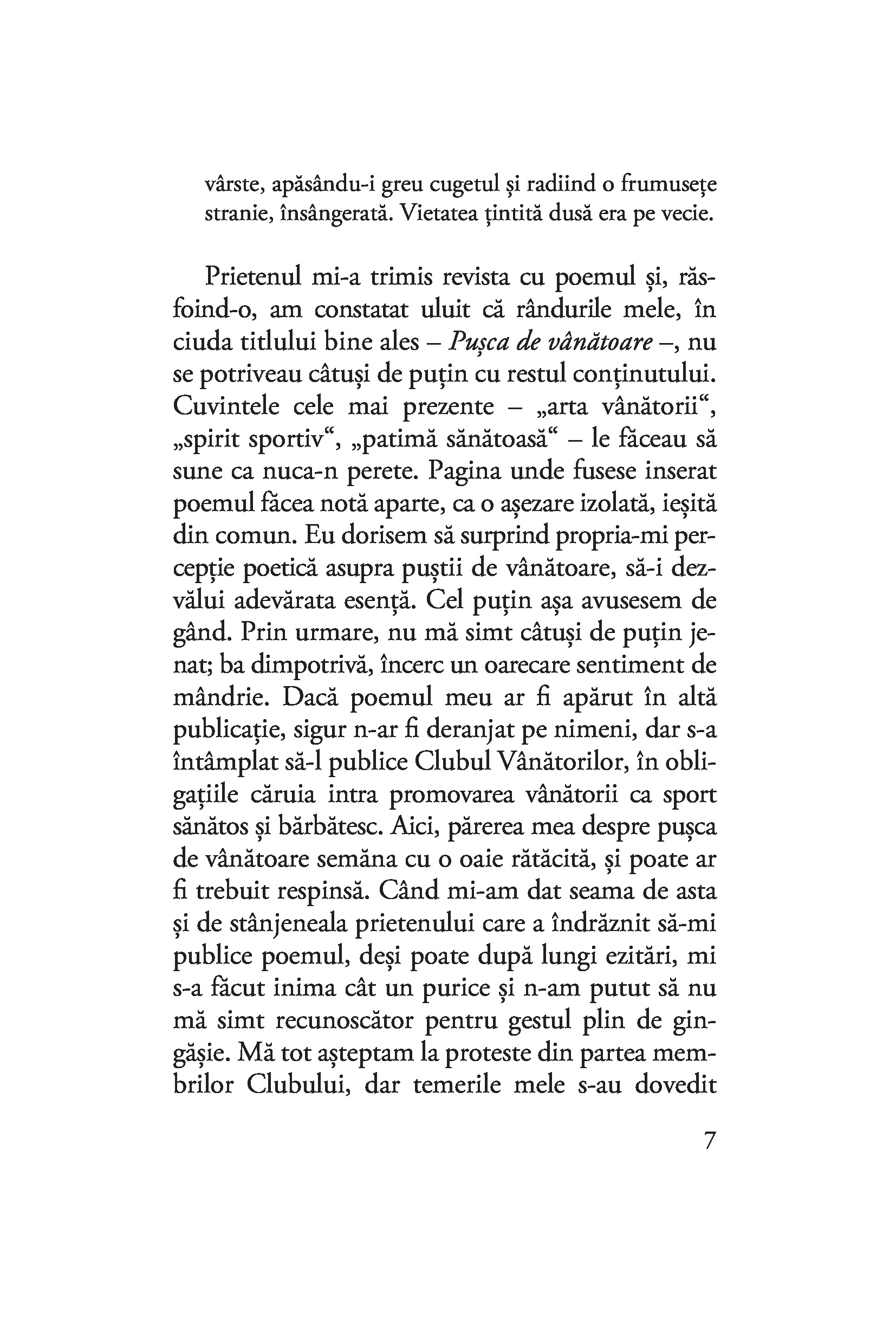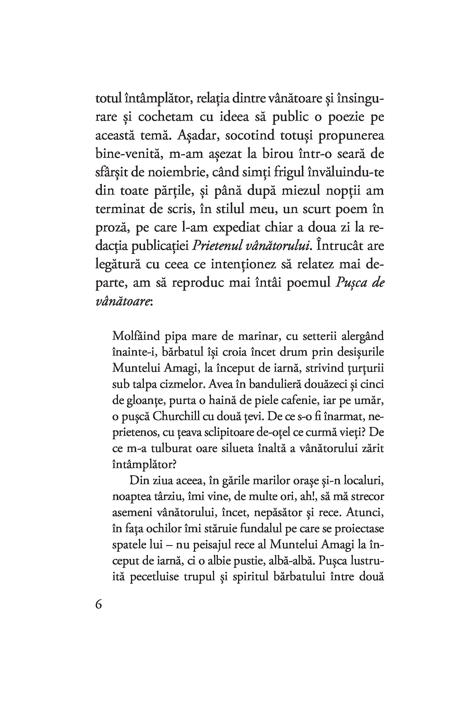 Este oare cu putință ca o pușcă de vânătoare dintr-un poem apărut într-o revistă cinegetică să lege patru destine? Poate să ucidă o pușcă pe trăgaciul căreia nu apasă nimeni? De ce moare altcineva decât femeia luată în cătarea armei? Cine e vânatul și cine vânătorul? Cum poate fi apărată cu pușca o amintire? Ce se întâmplă când un jurnal nu este aruncat în foc? Dar atunci când scrisorile rănesc mai tare decât gloanțele? Cititorul nu trebuie să îmbrace un chimono ca să poată răspunde la toate aceste întrebări. E suficient să-și lase deoparte ochelarii de european și să pătrundă liniștit în această nespus de frumoasă lume a sugestiilor.