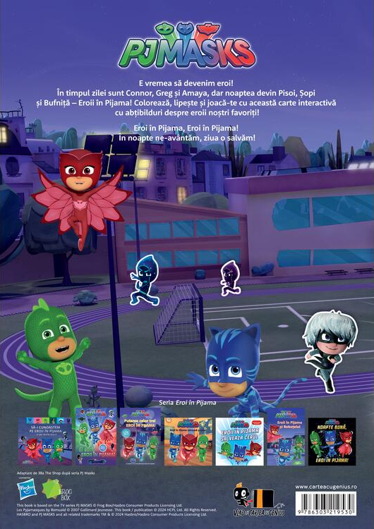 În timpul zilei sunt Connor, Greg și Amaya, dar noaptea devin Pisoi, Șopi și Bufniță - Eroii în Pijama! Colorează, lipește și joacă-te cu această carte interactivă cu abțibilduri despre eroii noștri favoriți!