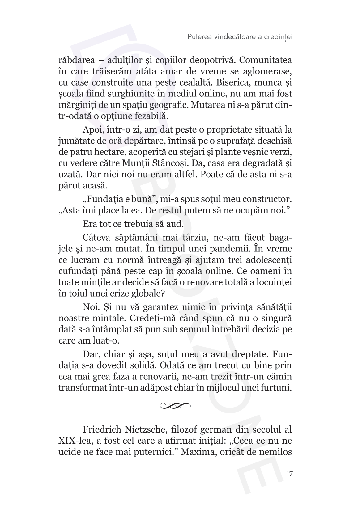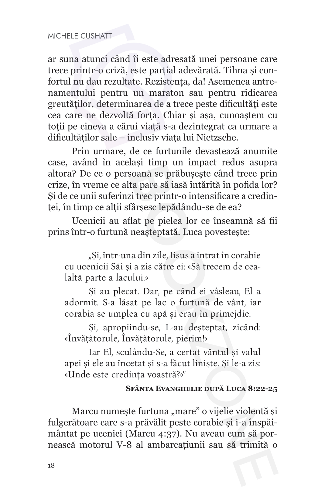 Acestui diagnostic i s-a alăturat apoi un al doilea și un al treilea diagnostic de cancer, o adopție dificilă și un divorț, o pandemie și nenumărate greutăți, dar credința lui Michele a rezistat. Astăzi, după ce și-a pierdut cea mai mare parte a limbii, autoarea împărtășește lumii cele 10 practici spirituale care au ajutat-o își mențină speranța și să își reconstruiască viața, în ciuda tuturor obstacolelor. Dacă și tu te afli într-un punct în care tristețea, mâhnirea, nesiguranța sau rușinea îți afectează relația cu Dumnezeu, această carte este aici pentru a-ți dezvălui lumina de la capătul tunelului.