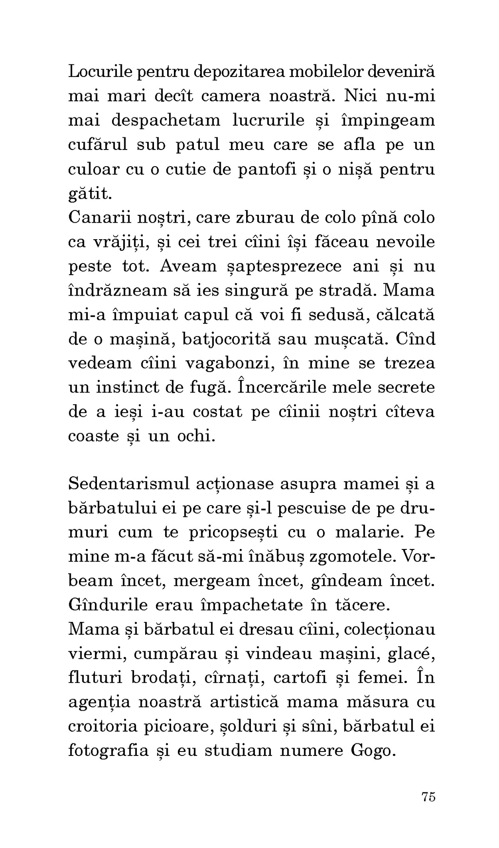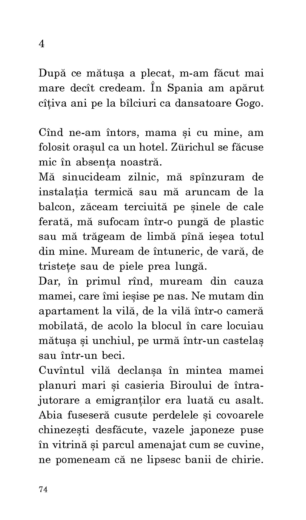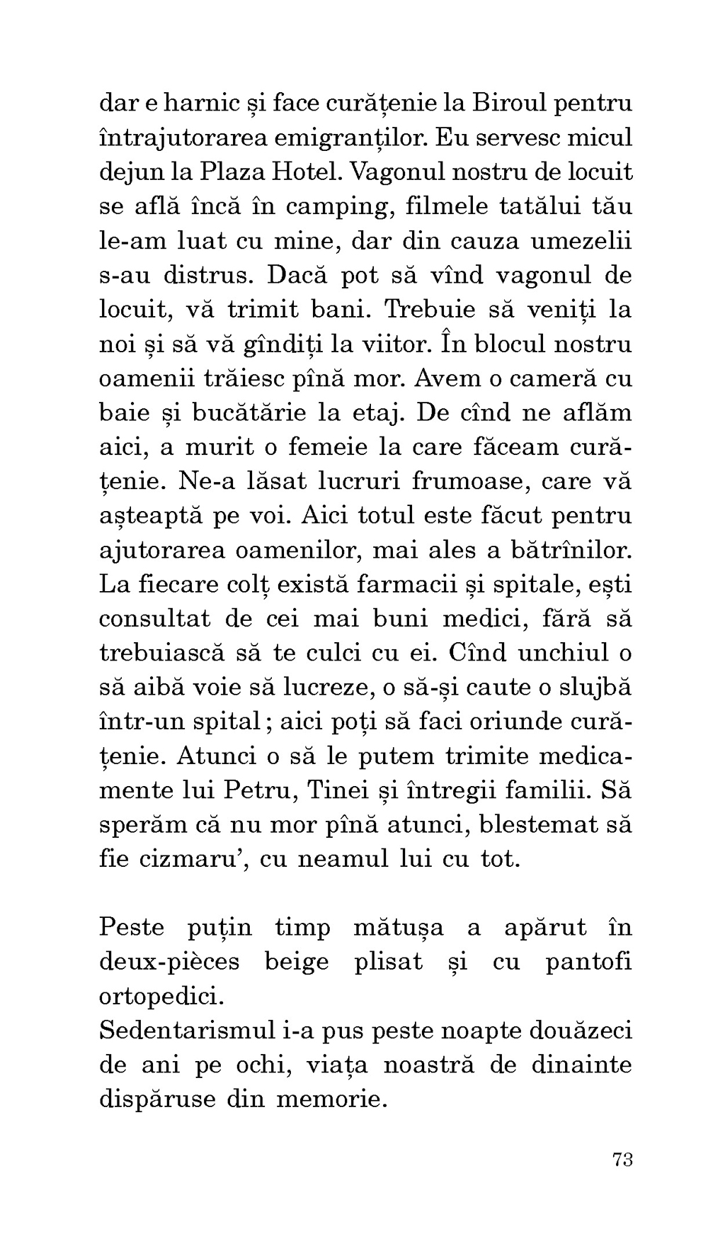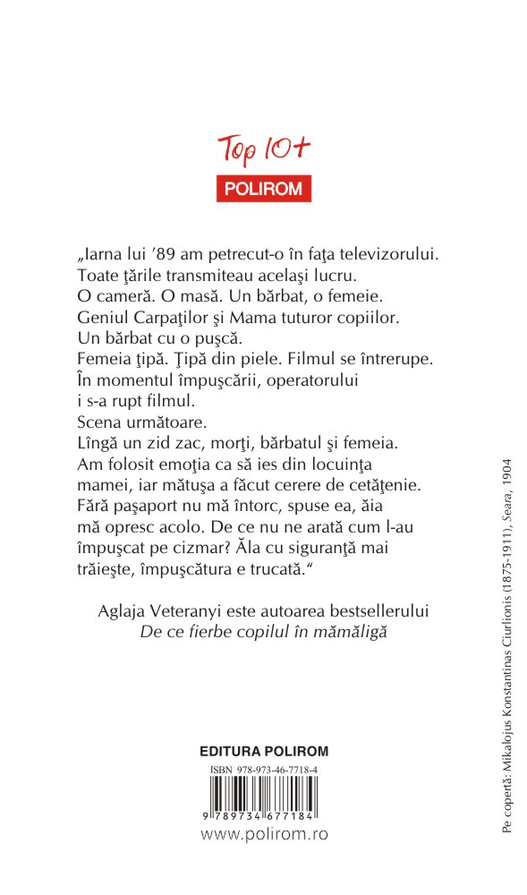 „Iarna lui ’89 am petrecut-o în faţa televizorului. Toate ţările transmiteau acelaşi lucru. O cameră. O masă. Un bărbat, o femeie. Geniul Carpaţilor şi Mama tuturor copiilor. Un bărbat cu o puşcă. Femeia ţipă. Ţipă din piele. Filmul se întrerupe. În momentul împuşcării, operatorului i s-a rupt filmul. Scena următoare. Lîngă un zid zac, morţi, bărbatul şi femeia. Am folosit emoţia ca să ies din locuinţa mamei, iar mătuşa a făcut cerere de cetăţenie. Fără paşaport nu mă întorc, spuse ea, ăia mă opresc acolo. De ce nu ne arată cum l-au împuşcat pe cizmar? Ăla cu siguranţă mai trăieşte, împuşcătura e trucată.”
