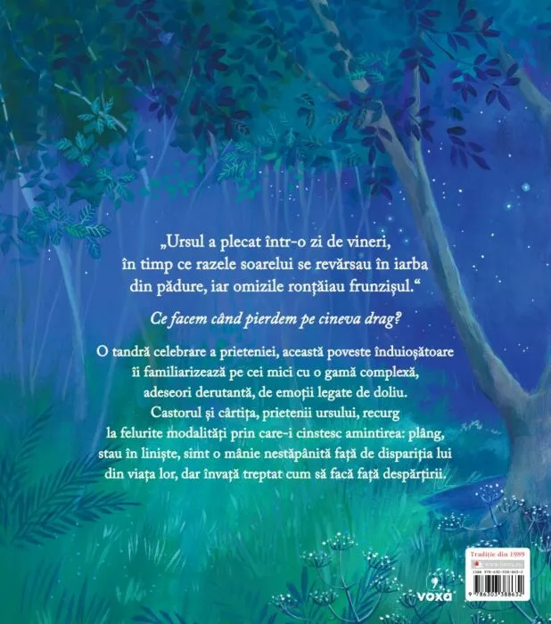 O tandră celebrare a prieteniei, această poveste înduioșătoare îi familiarizează pe cei mici cu o gamă complexă, adeseori derutantă, de emoții legate de doliu. Castorul și cârtița, prietenii ursului, recurg la felurite modalități prin care-i cinstesc amintirea: plâng, stau în liniște, simt o mânie nestăpânită față de dispariția lui din viața lor, dar învață treptat cum să facă față despărțirii.