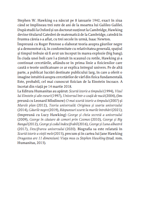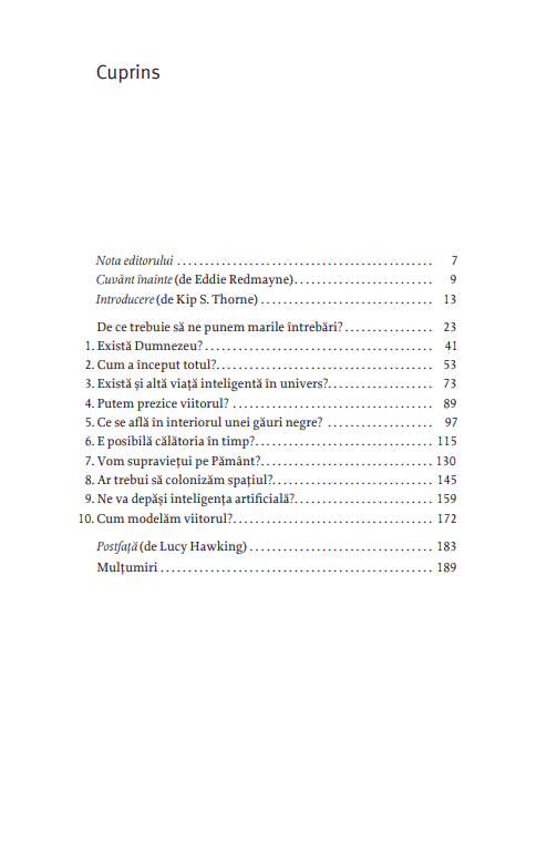 Există Dumnezeu? Cum a început totul? Putem prezice viitorul? E posibilă călătoria în timp? Ar trebui să colonizăm spațiul? Ne va depăși inteligența artificială? Această carte și răspunsurile pe care ni le oferă reprezintă ultima mărturie a uneia dintre cele mai strălucite minți.