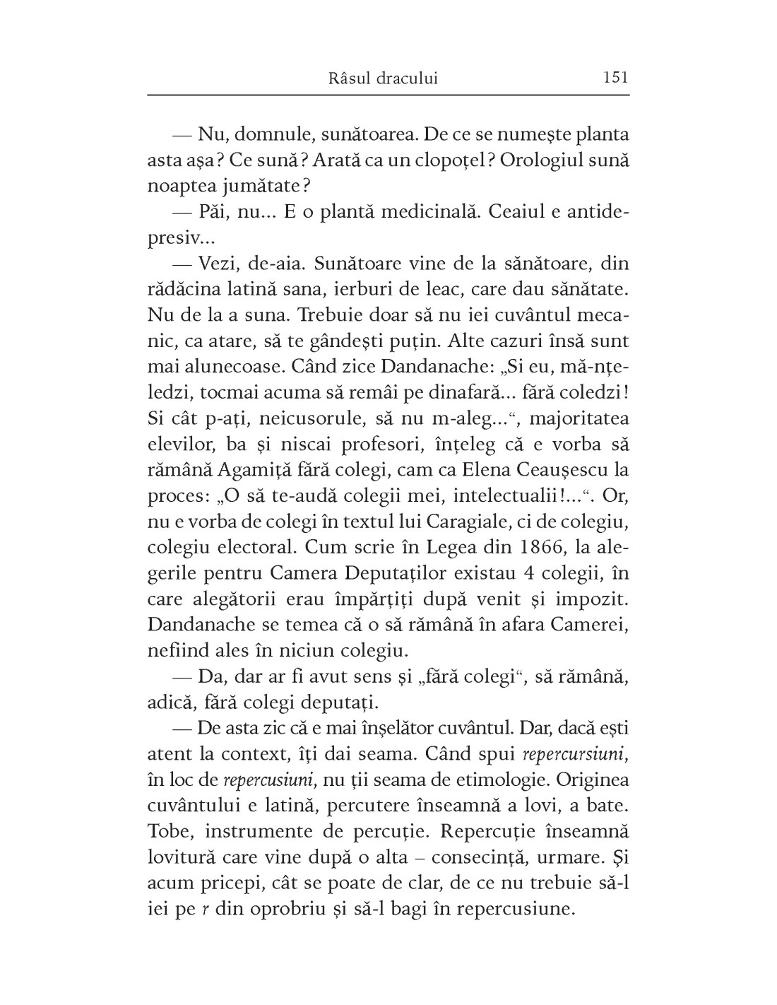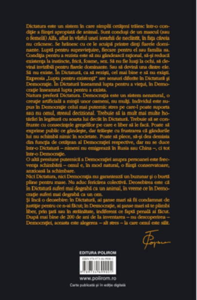 „Dictatura este un sistem în care simplii cetățeni trăiesc într-o condiție a ființei apropiată de animal. Sunt conduși de un mascul (sau o femelă) Alfa, aflat în vârful unei ierarhii de neclintit, în fața căreia nu crâcnesc. Se hrănesc cu ce le scuipă printre dinți fiarele dominante. Luptă pentru supraviețuire, fiecare pentru el sau familia sa.