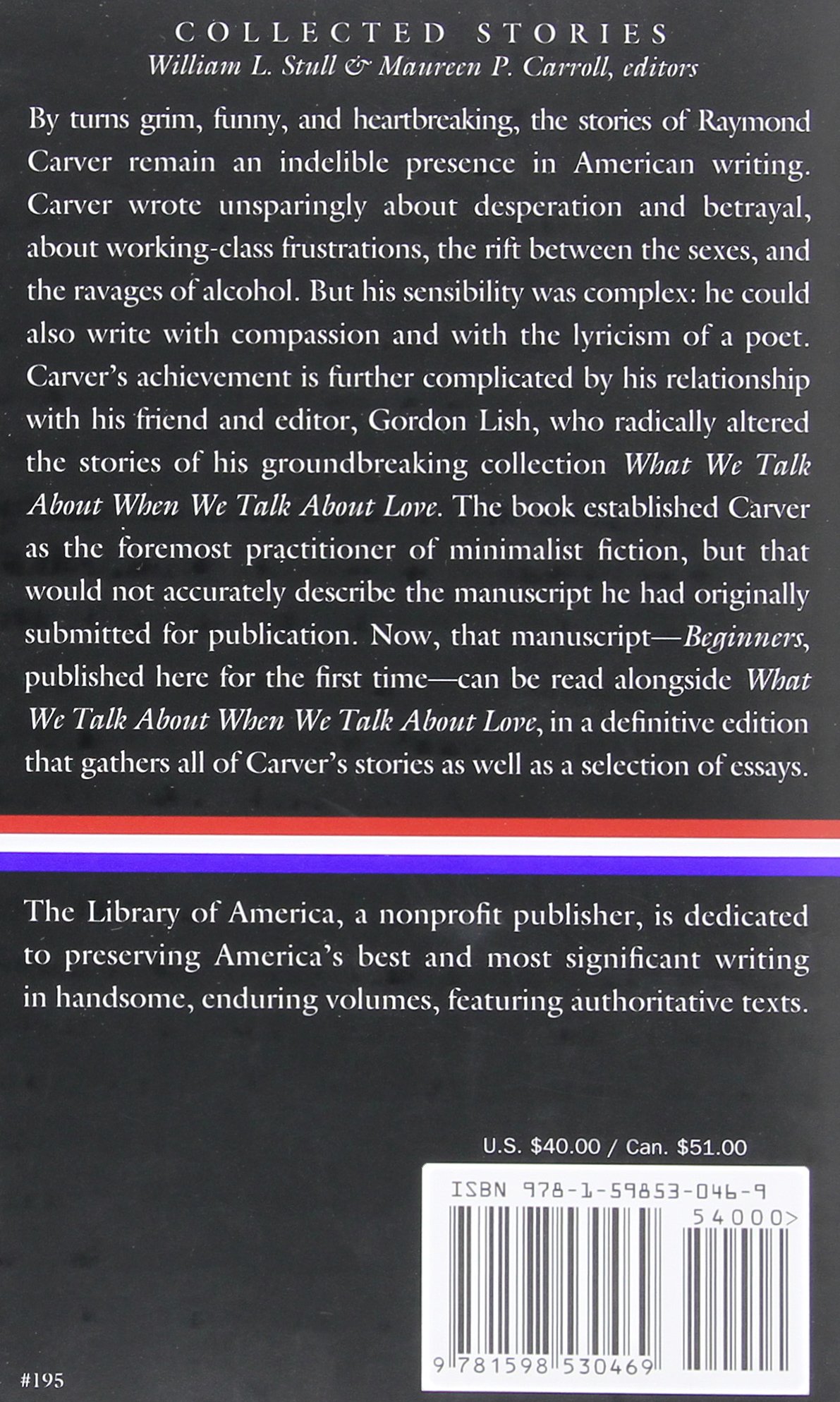 In gathering all of Carver's stories, including early sketches and posthumously discovered works, The Library of America's Collected Stories provides a comprehensive overview of Carver's career as we have come to know it- the promise of Will You Please Be Quiet, Please? and the breakthrough of What We Talk About, on through the departures taken in Cathedral and the pathos of the late stories. But it also prompts a fresh consideration of Carver by presenting Beginners, an edition of the manuscript of What We Talk About When We Talk About Love that Carver submitted to Gordon Lish, his editor and a crucial influence on his development. Lish's editing was so extensive that at one point Carver wrote him an anguished letter asking him not to publish the book; now, for the first time, readers can read both the manuscript and published versions of the collection that established Carver as a major American writer. Offering a fascinating window into the complex, fraught relation between writer and editor, Beginners expands our sense of Carver and is essential reading for anyone who cares about his achievement.