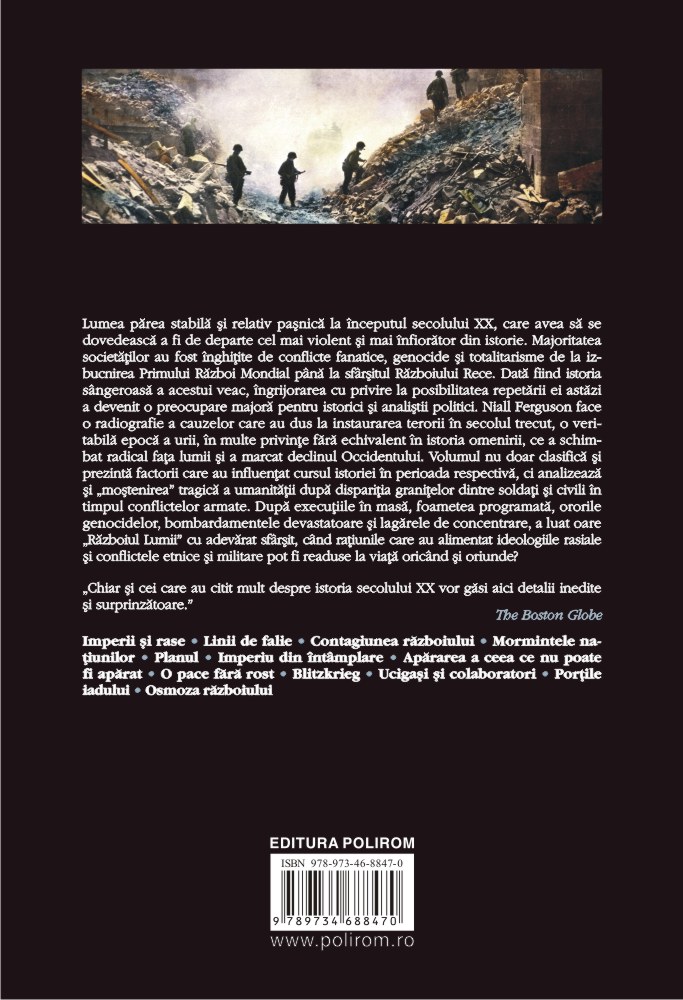 Lumea părea stabilă și relativ pașnică la începutul secolului XX, care avea să se dovedească a fi de departe cel mai violent și mai înfiorător din istorie. Majoritatea societăților au fost înghițite de conflicte fanatice, genocide și totalitarisme de la izbucnirea Primului Război Mondial până la sfârșitul Războiului Rece. Dată fiind istoria sângeroasă a acestui veac, îngrijorarea cu privire la posibilitatea repetării ei astăzi a devenit o preocupare majoră pentru istorici și analiștii politici. Niall Ferguson face o radiografie a cauzelor care au dus la instaurarea terorii în secolul trecut, o veritabilă epocă a urii, în multe privințe fără echivalent în istoria omenirii, ce a schimbat radical fața lumii și a marcat declinul Occidentului. Volumul nu doar clasifică și prezintă factorii care au influențat cursul istoriei în perioada respectivă, ci analizează și „moștenirea” tragică a umanității după dispariția granițelor dintre soldați și civili în timpul conflictelor armate. După execuțiile în masă, foametea programată, ororile genocidelor, bombardamentele devastatoare și lagărele de concentrare, a luat oare „Războiul Lumii” cu adevărat sfârșit, când rațiunile care au alimentat ideologiile rasiale și conflictele etnice și militare pot fi readuse la viață oricând și oriunde?